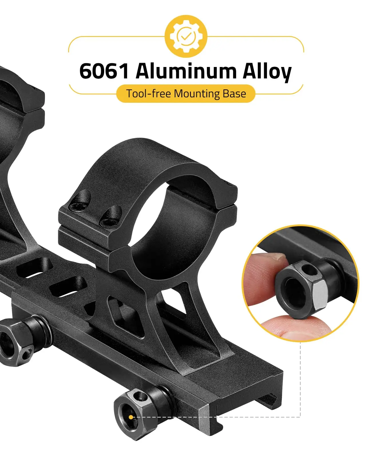 Soporte voladizo desplazado: la extensión delantera de 2'' proporciona mayor espacio para ajustar el alivio ocular, lo que facilita encontrar una posición de puntería cómoda