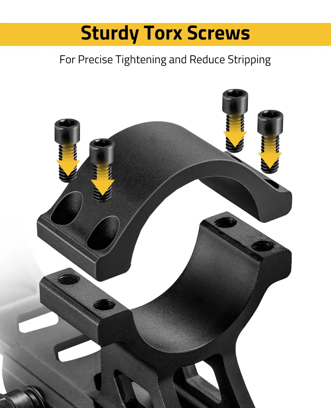 Tornillos Torx T-15: Los anillos de montaje en telescopio de 30 mm están asegurados con tornillos Torx T-15, conocidos por su resistencia y durabilidad.Además, se incluyen cuatro tornillos de repuesto para minimizar el impacto de la pérdida o daño del tornillo.