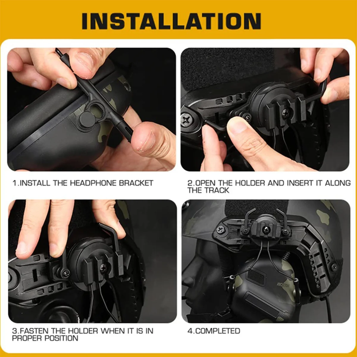 El soporte puede girar libremente 360 grados, la diadema se separa y se engancha en el soporte y el clip del soporte se puede fijar en el riel del casco táctico.