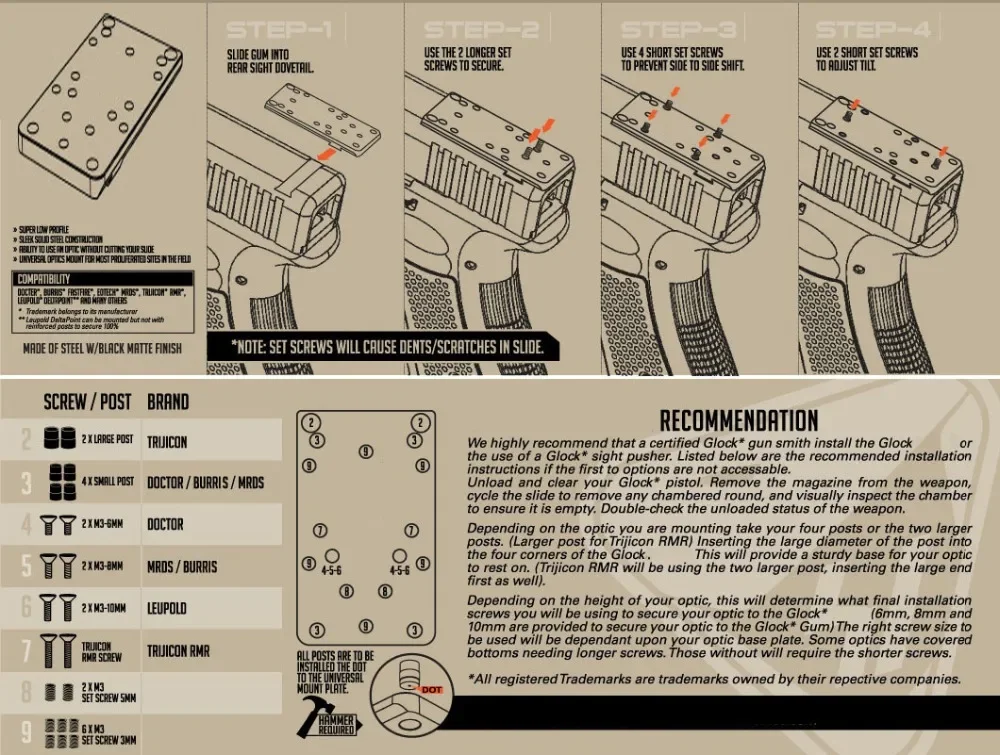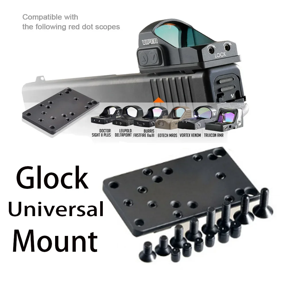 Características: - Soporte óptico universal para la mayoría de los sitios proliferados en el campo - Perfil súper bajo - Posibilidad de utilizar una óptica sin cortar el deslizamiento. - Construcción elegante y sólida de acero: el soporte se fija a la corredera mediante la cola de milano con 6 tornillos de fijación. Especificaciones del producto: Longitud: 1 7/8” Ancho: 1 1/8” Alto: 1/8” Peso: 1,3 oz (con accesorios de montaje) Materiales: acero Color: negro El paquete incluye: 1 x soporte de base GLOCK 1 x tornillos de montaje