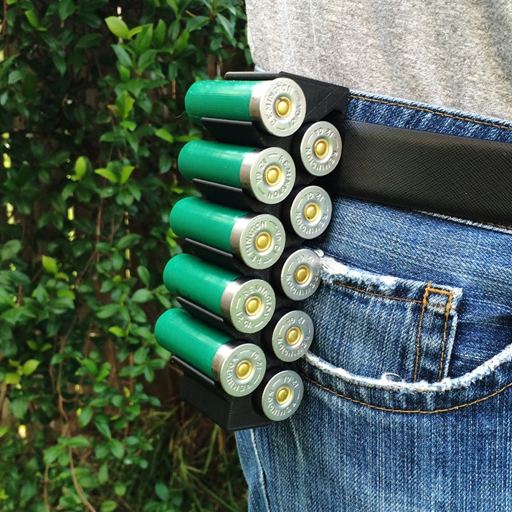 Carrier comfortably clips to belt or pants and allows for rapid deployment of up to 10 shots.