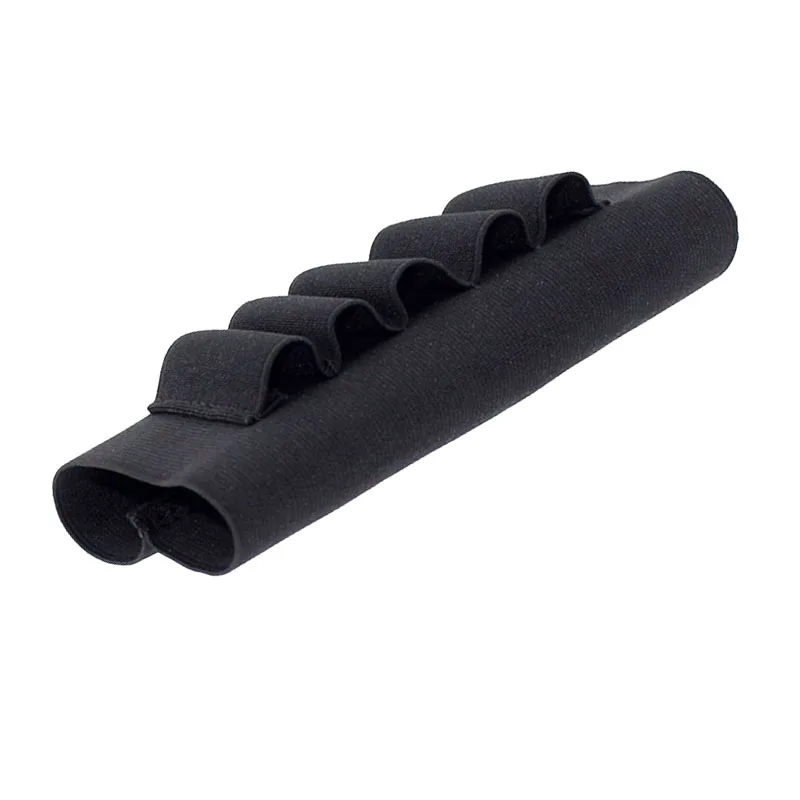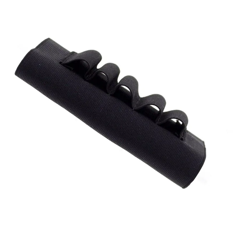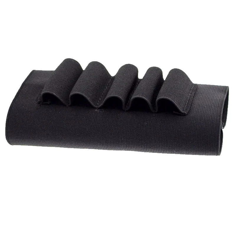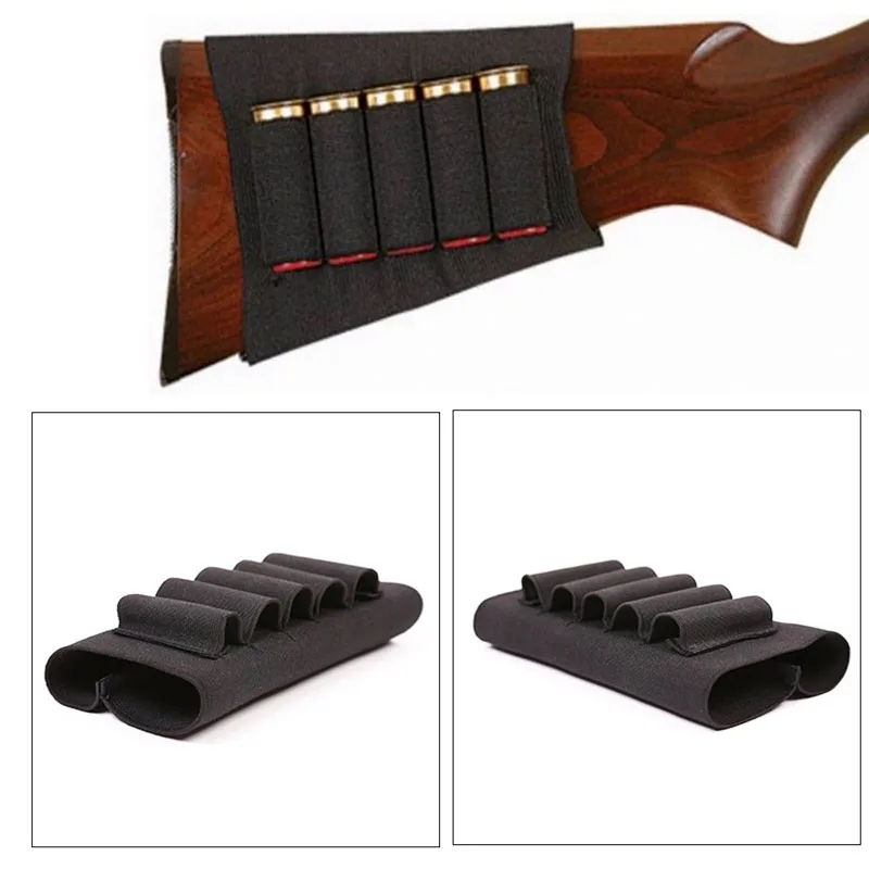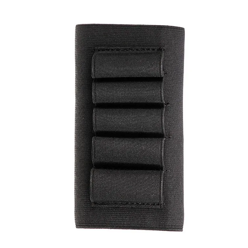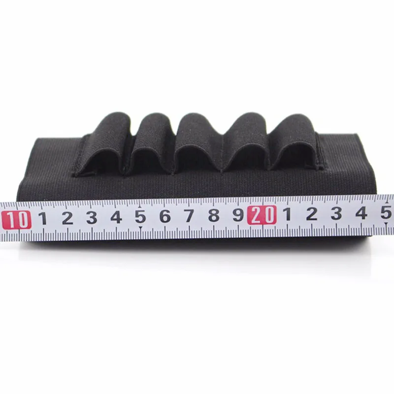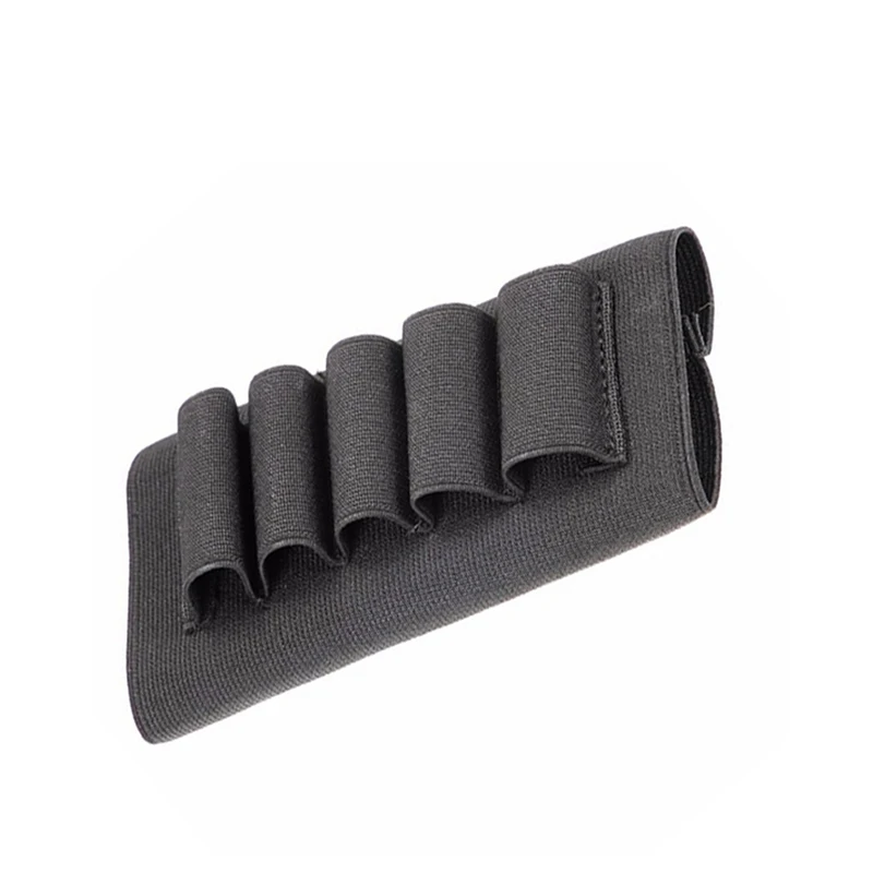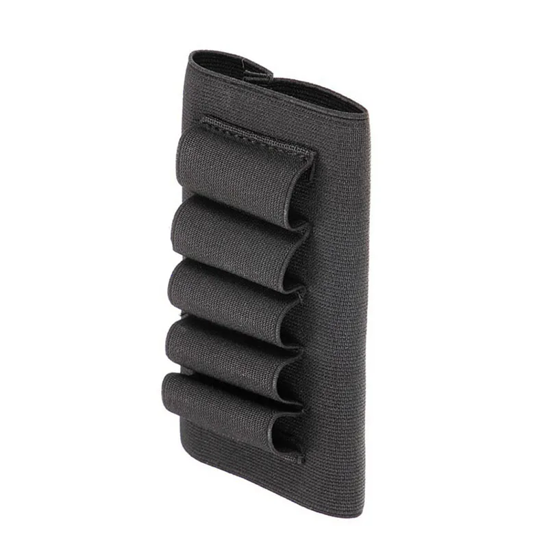 Hecho de correas elásticas de nailonEl soporte de culata sostiene 5 cartuchos de escopetaConchas sostenidas por bucles elásticosPerfecto para la caza o el rangoMaterial: nailon elásticoPeso: 30gColor: negroTamaño: 15cm X 9,5 cm