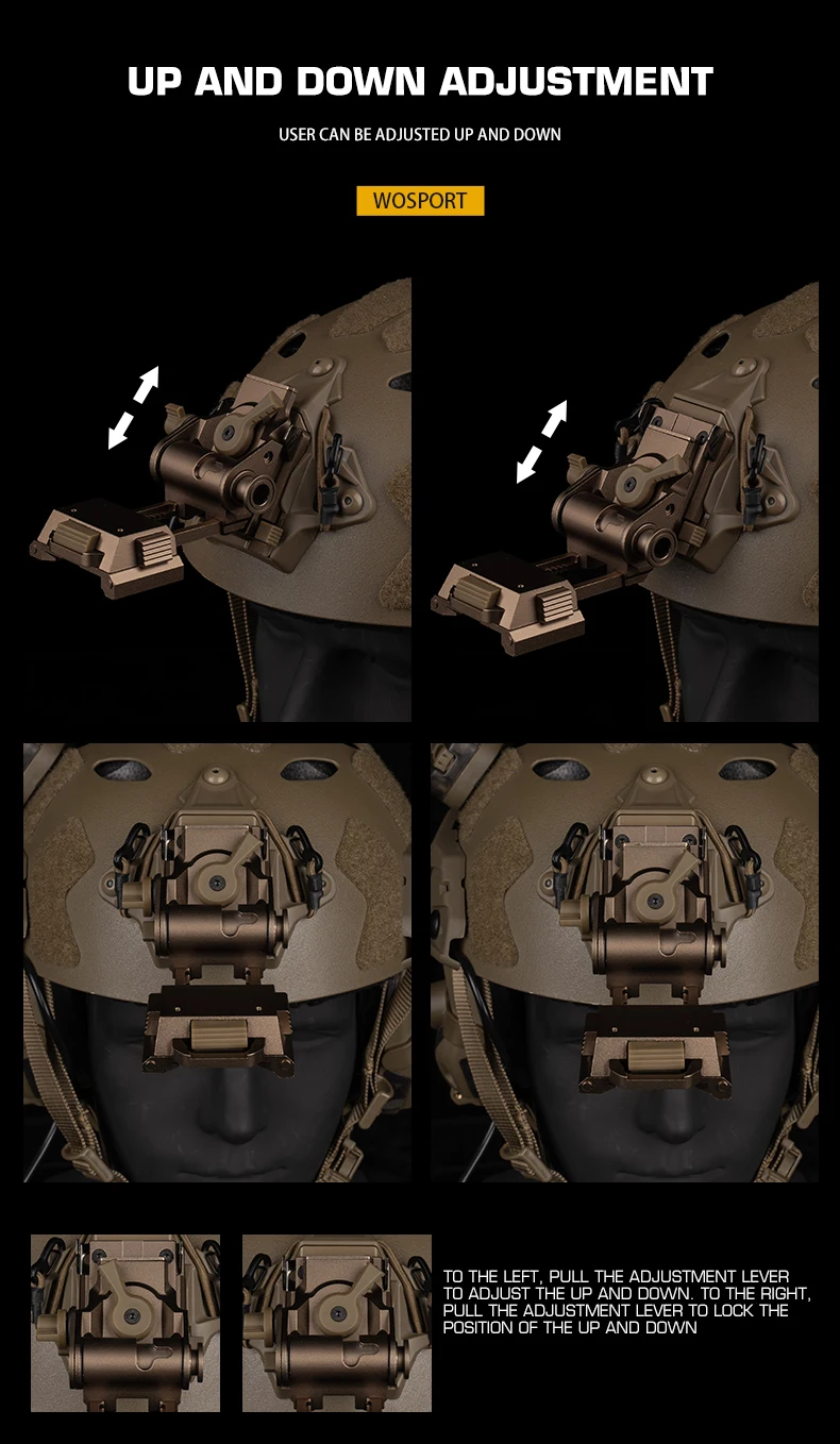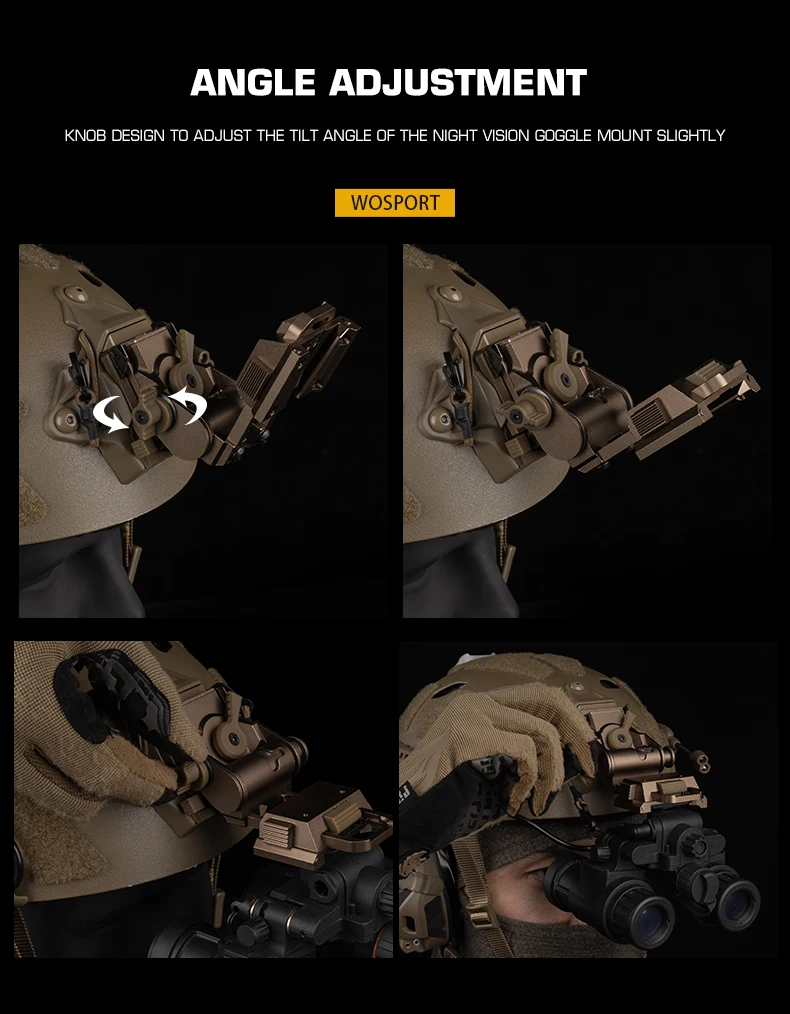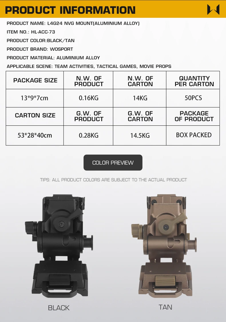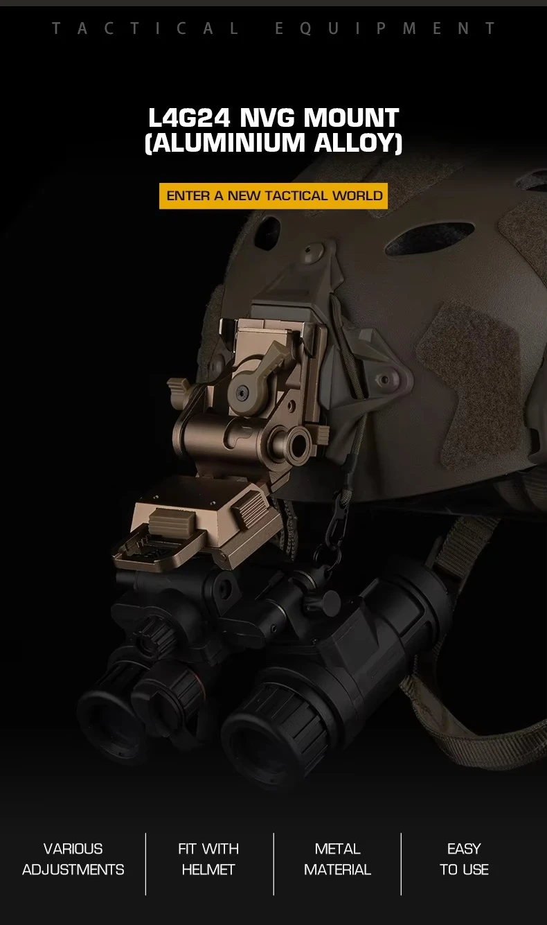 Información del producto:Nombre del producto: Montaje NVG L4G24 (aleación de aluminio) Artículo No.: HL-ACC-73 Color del producto: negro/tan Material del producto: aleación de aluminio. Escena aplicable: actividades en equipo, juegos tácticos, accesorios de películas.