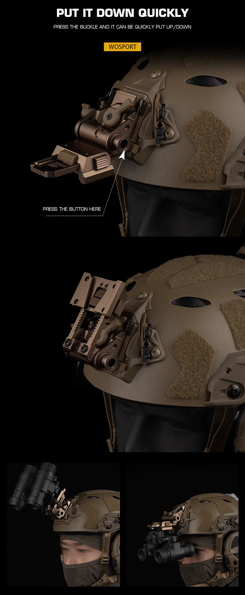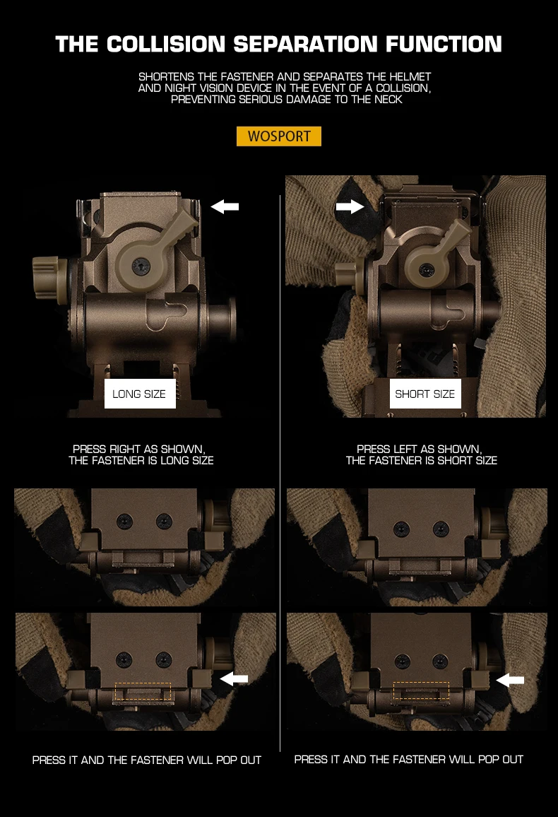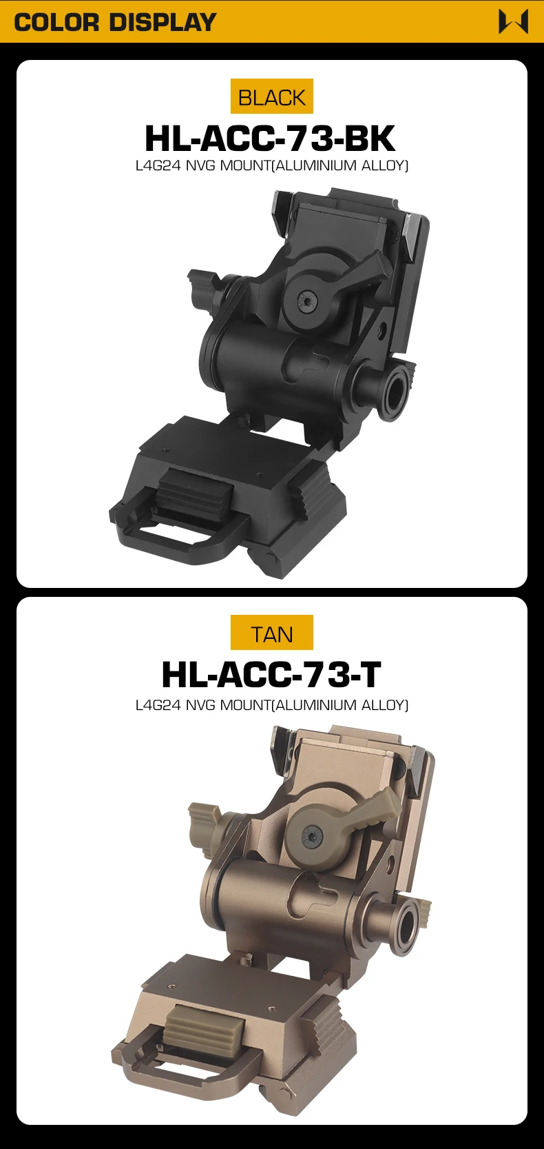 Información del producto:Nombre del producto: Montaje NVG L4G24 (aleación de aluminio) Artículo No.: HL-ACC-73 Color del producto: negro/tan Material del producto: aleación de aluminio. Escena aplicable: actividades en equipo, juegos tácticos, accesorios de películas.