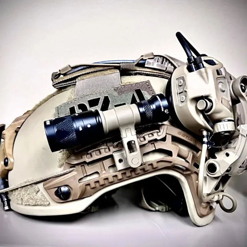 2. Coloca la linterna hacia arriba y sobre el riel del casco, anidándola en una posición de perfil bajo;