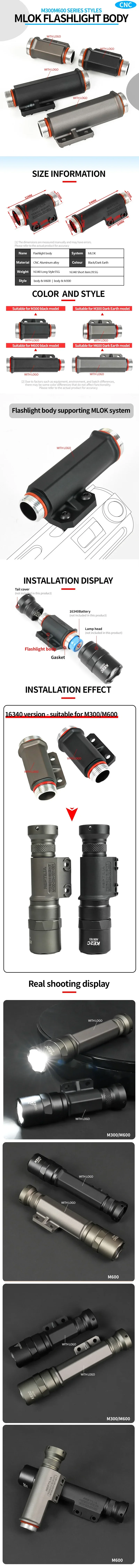 Soporte de cuerpo de luz táctica para linterna serie M300/M600, conjunto de aluminio con cuerpo de luz de batería 16340 para linterna de riel Mlok