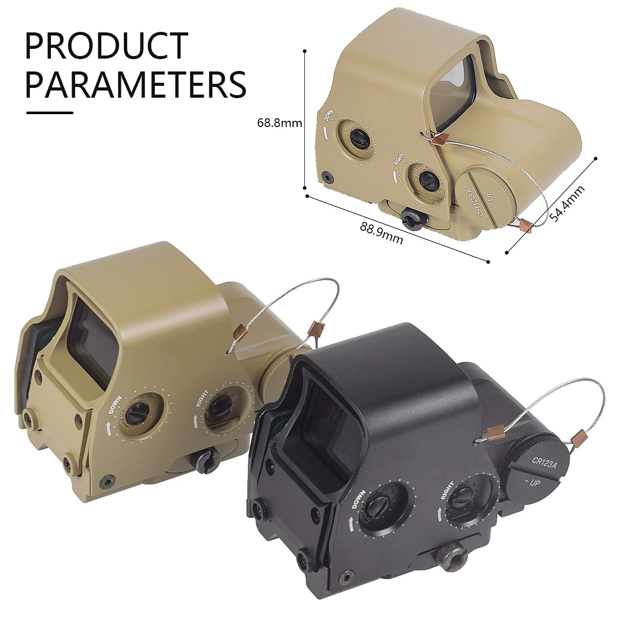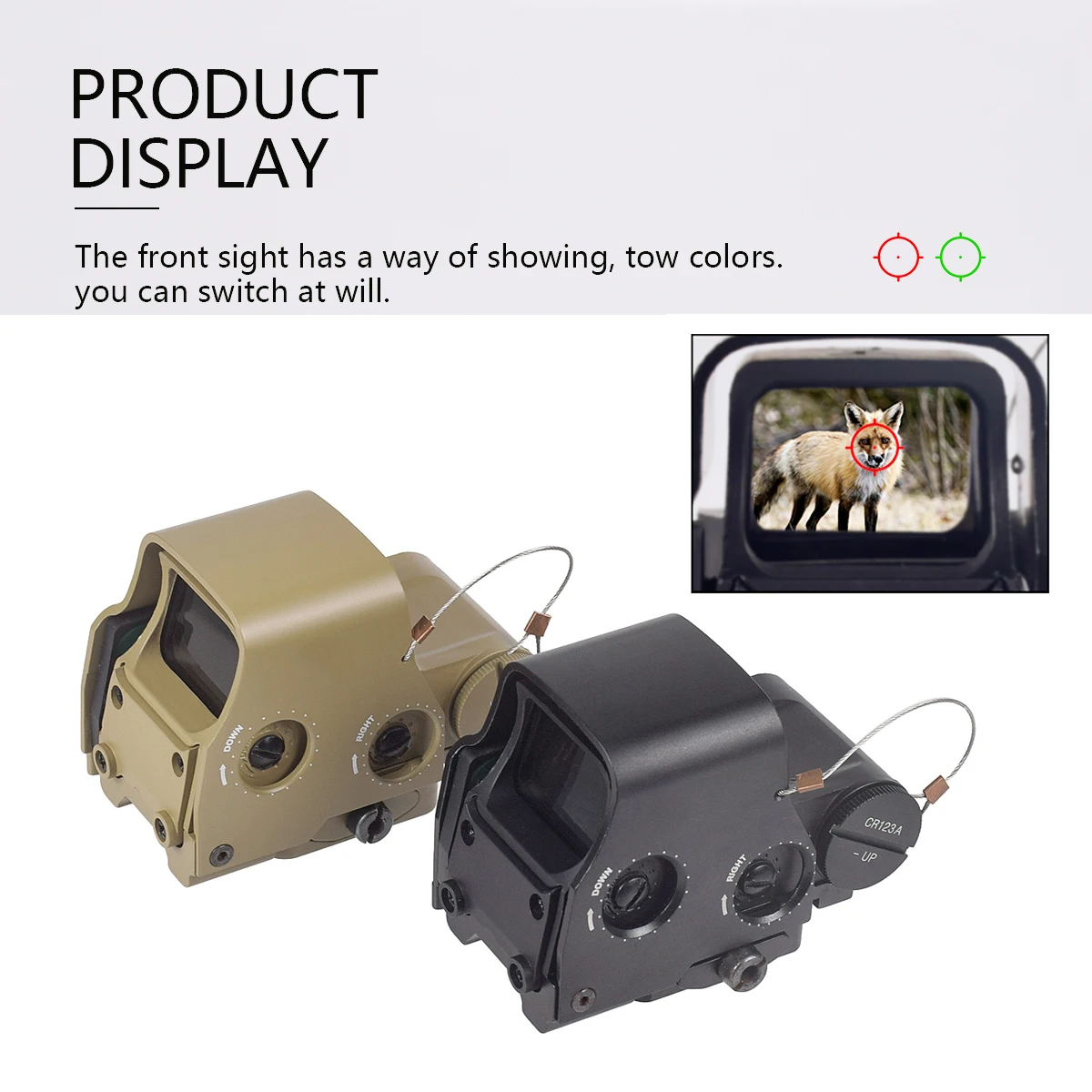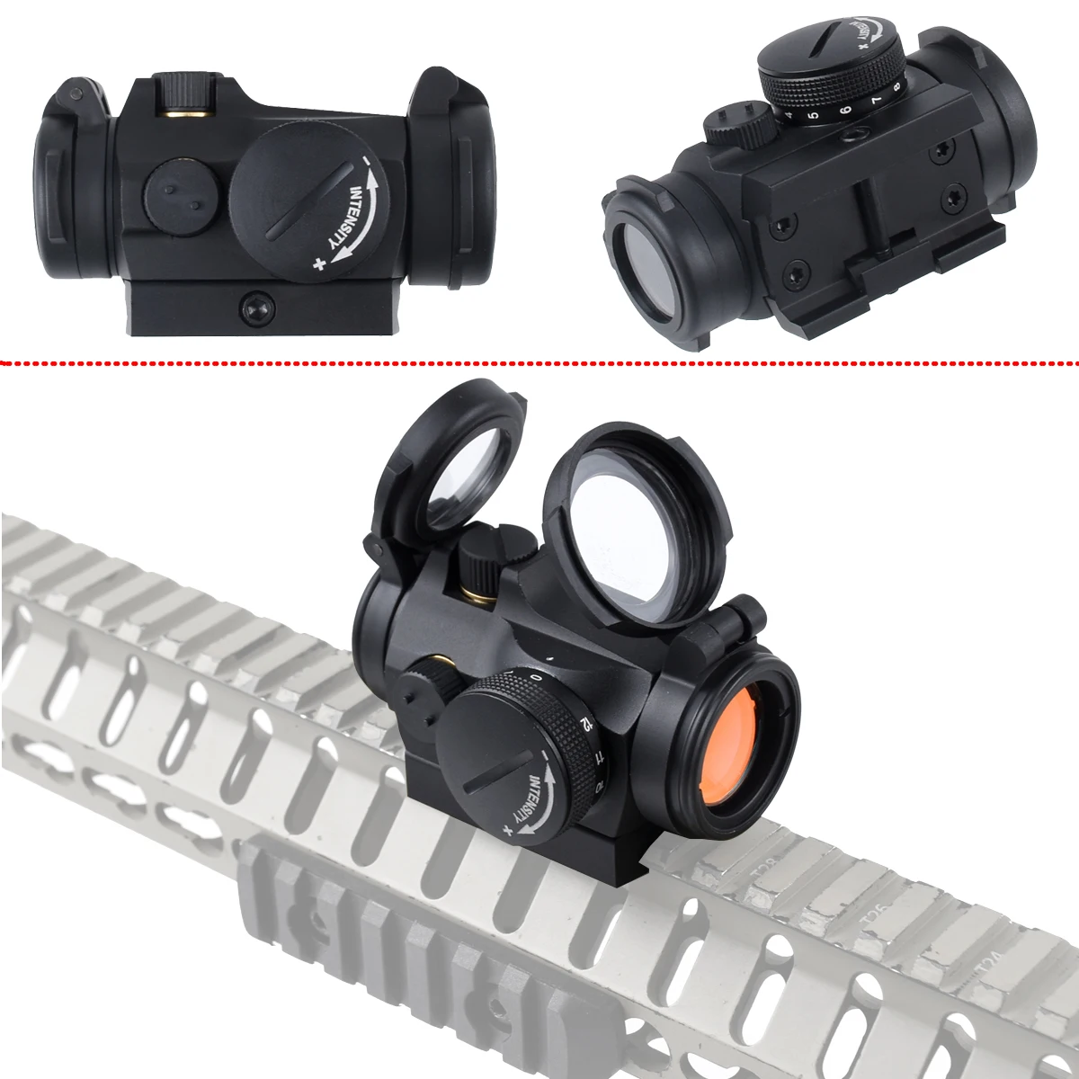 * Tapas de lente abatibles: la parte frontal es sólida y la trasera es transparente, lo que permite al usuario disparar con ambos ojos abiertos y las tapas de lente cerradas en una situación de emergencia.