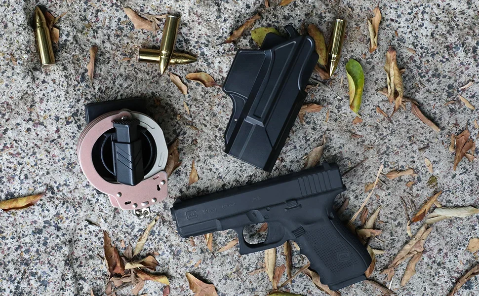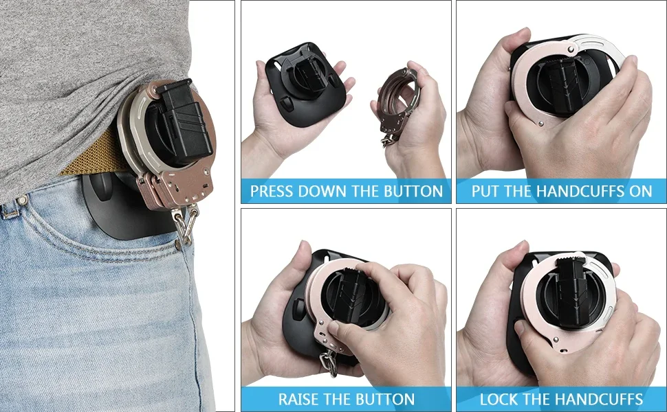 Soporte para esposas de cinturón de servicio profesional: funda de liberación rápida para puños con bisagras/cadena, estuche con clip de polímero (seguridad/patol)