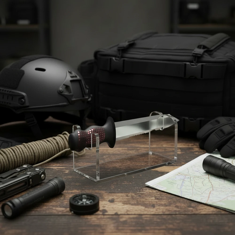El material de alta transparencia muestra los detalles de los cuchillos de manera vívida, ideal tanto para coleccionistas como para escaparates decorativos.