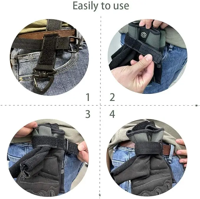 4. 【Aplicación】 Esta correa para guantes sujeta y aprieta los guantes.Con el botón de liberación rápida, es fácil de sujetar a la mochila, chaqueta táctica y cinturones.