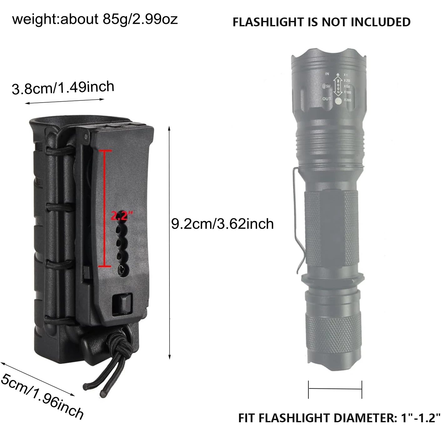 Este soporte para linterna se adapta a luces de 1"-1,2" de diámetro (la linterna NO está incluida).Mida el diámetro del cuerpo de su linterna antes de comprarla y asegúrese de que esté cerca de 1"-1,2".