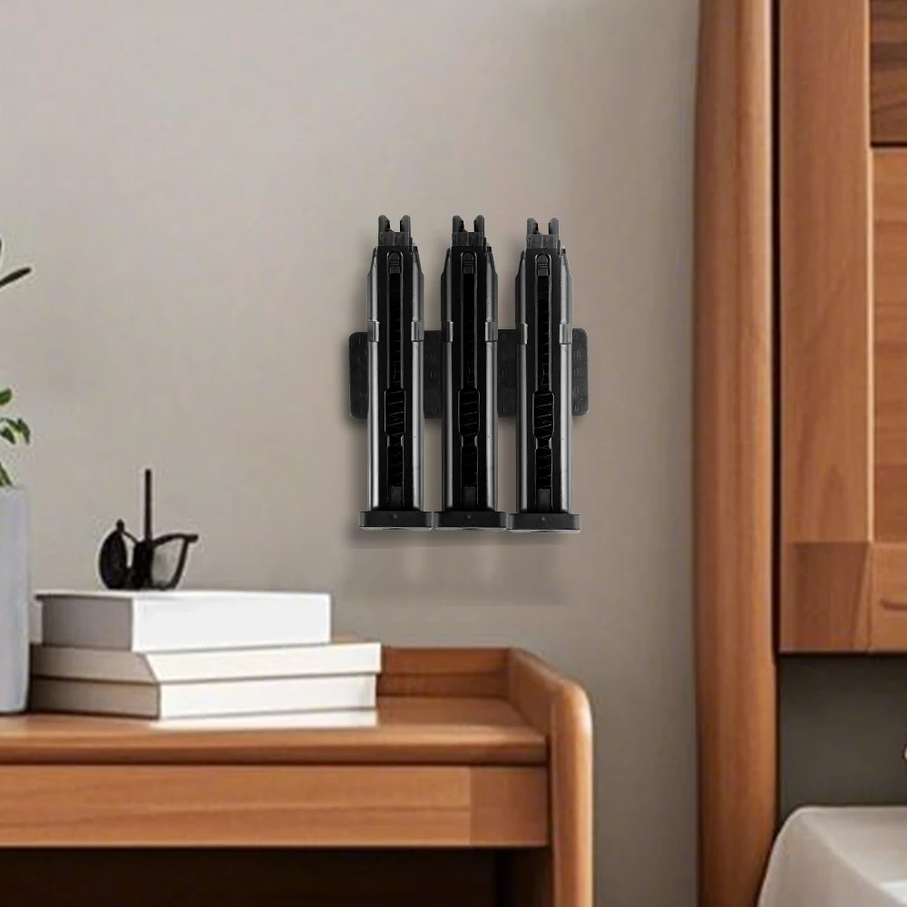 El almacenamiento seguro está hecho de materiales de alta calidad y este cargador magnético cuenta con potentes imanes de neodimio que pueden asegurar firmemente sus cargadores de armas de fuego, pistolas y cuchillos.Puede acomodar de forma segura hasta 3 cargadores metálicos cargados o descargados, lo que garantiza que su equipo esté siempre seguro y ordenado.