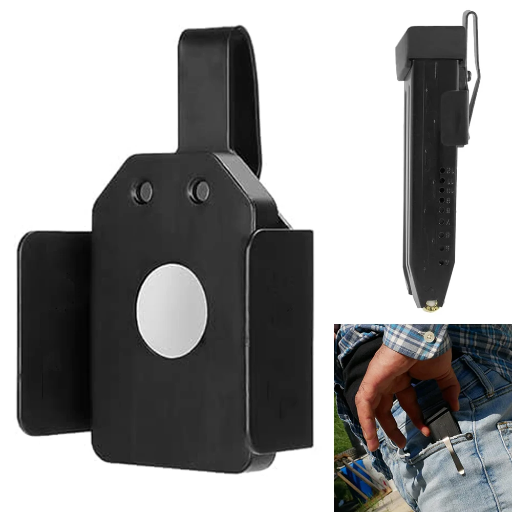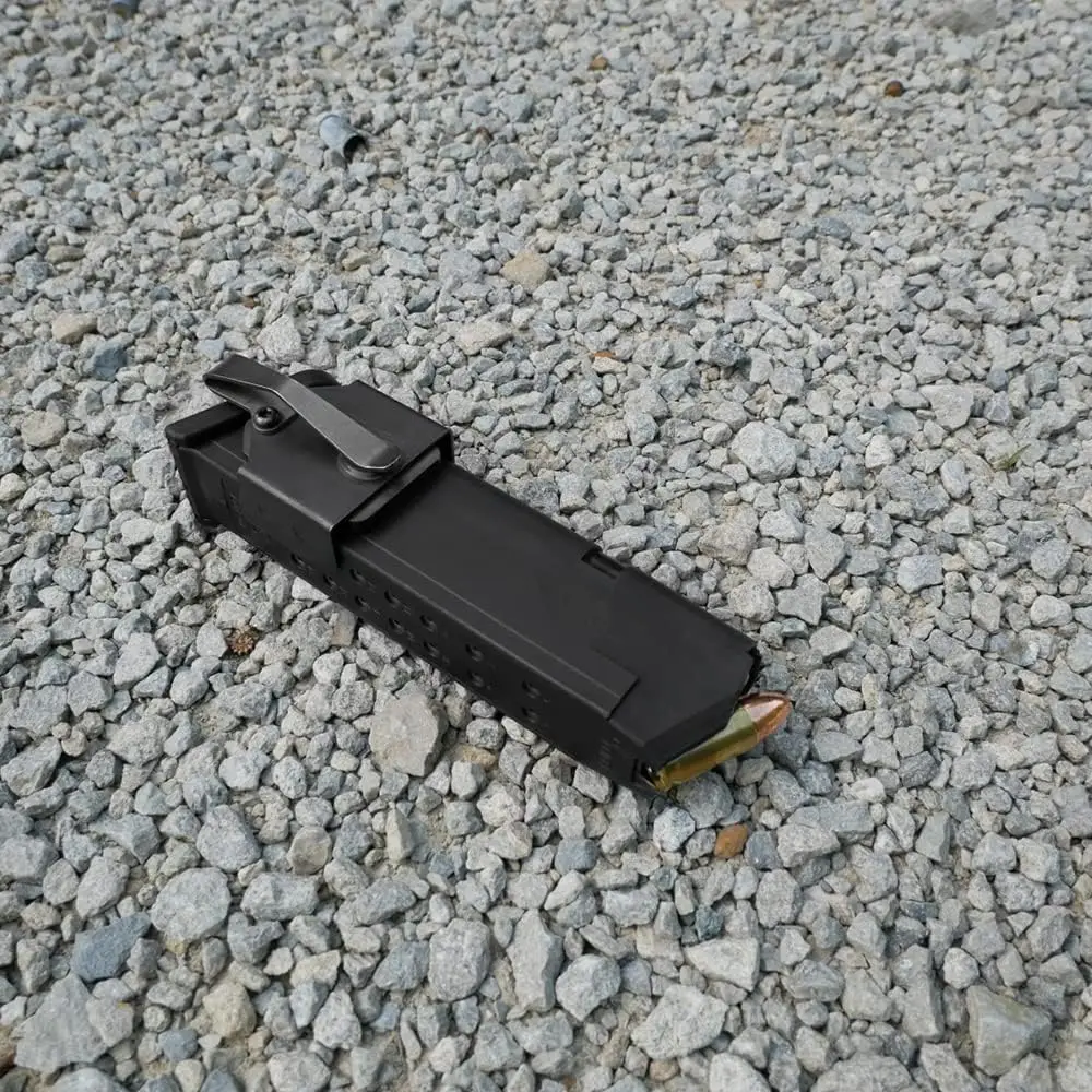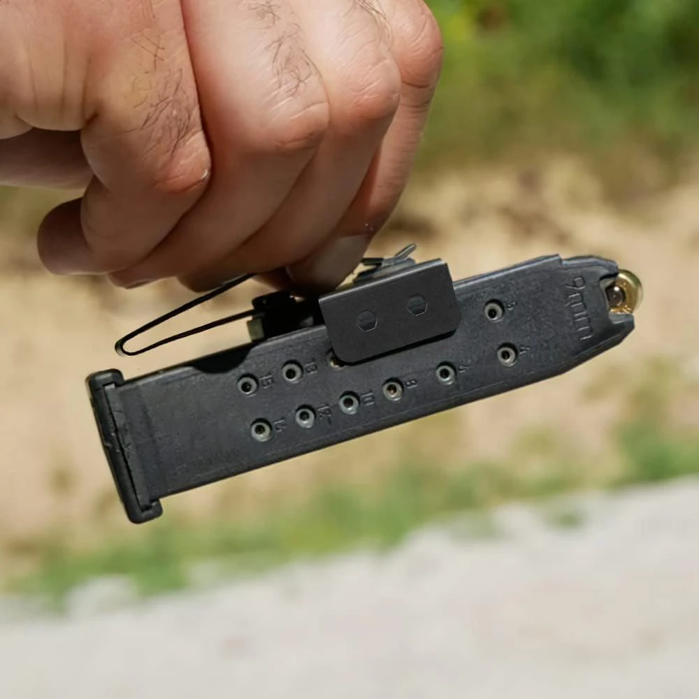 Nota:Pruebe su cargador para asegurarse de que sea magnético, diseñado para usarse únicamente con cargadores de metal, los cargadores Glock 19 - 10 rd no se mantienen muy bien compatibles, si tiene un resorte XD prueba su cargador para asegurarse de que sea magnético.(La mayoría extendidas no son magnéticas), solo funciona dentro del bolsillo, NO funciona fuera de la cintura, en un cinturón.