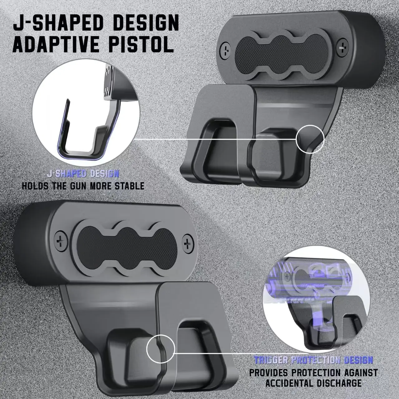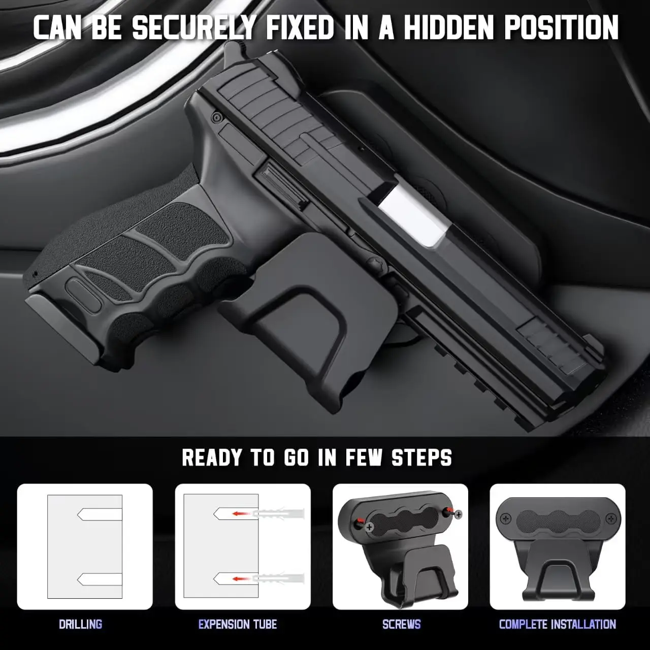 - Este versátil soporte para pistola es perfecto para usar en diversos entornos, como vehículos, hogares o garajes, brindando un almacenamiento confiable y seguro dondequiera que lo necesite.