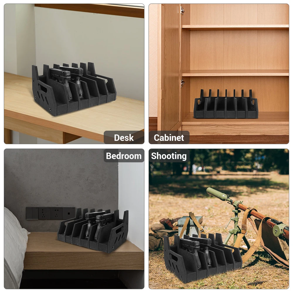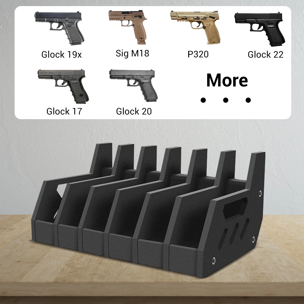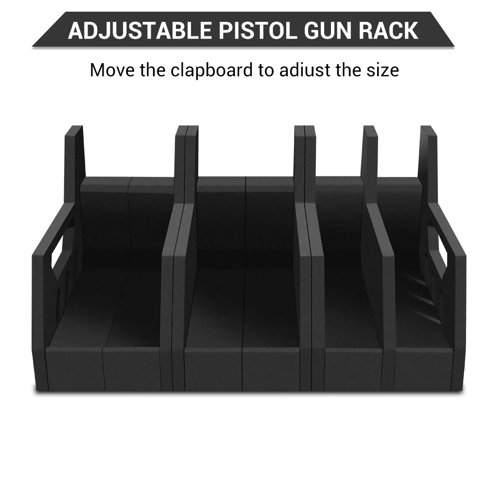 2. 【Diseño ajustable】 Cantidad de almacenamiento ajustable para pistolas, permite acomodar diferentes pistolas y adaptarse al espacio de almacenamiento limitado en el gabinete de sus cajas fuertes para armas.