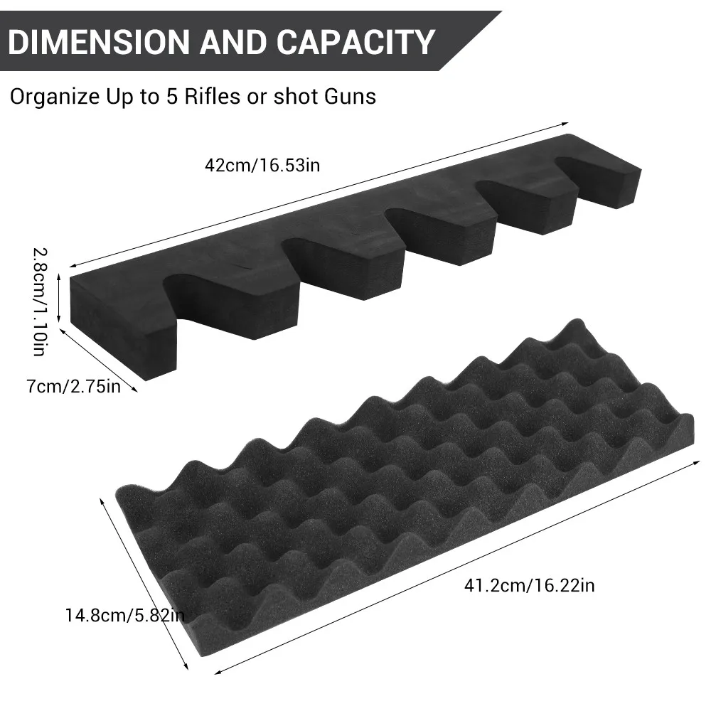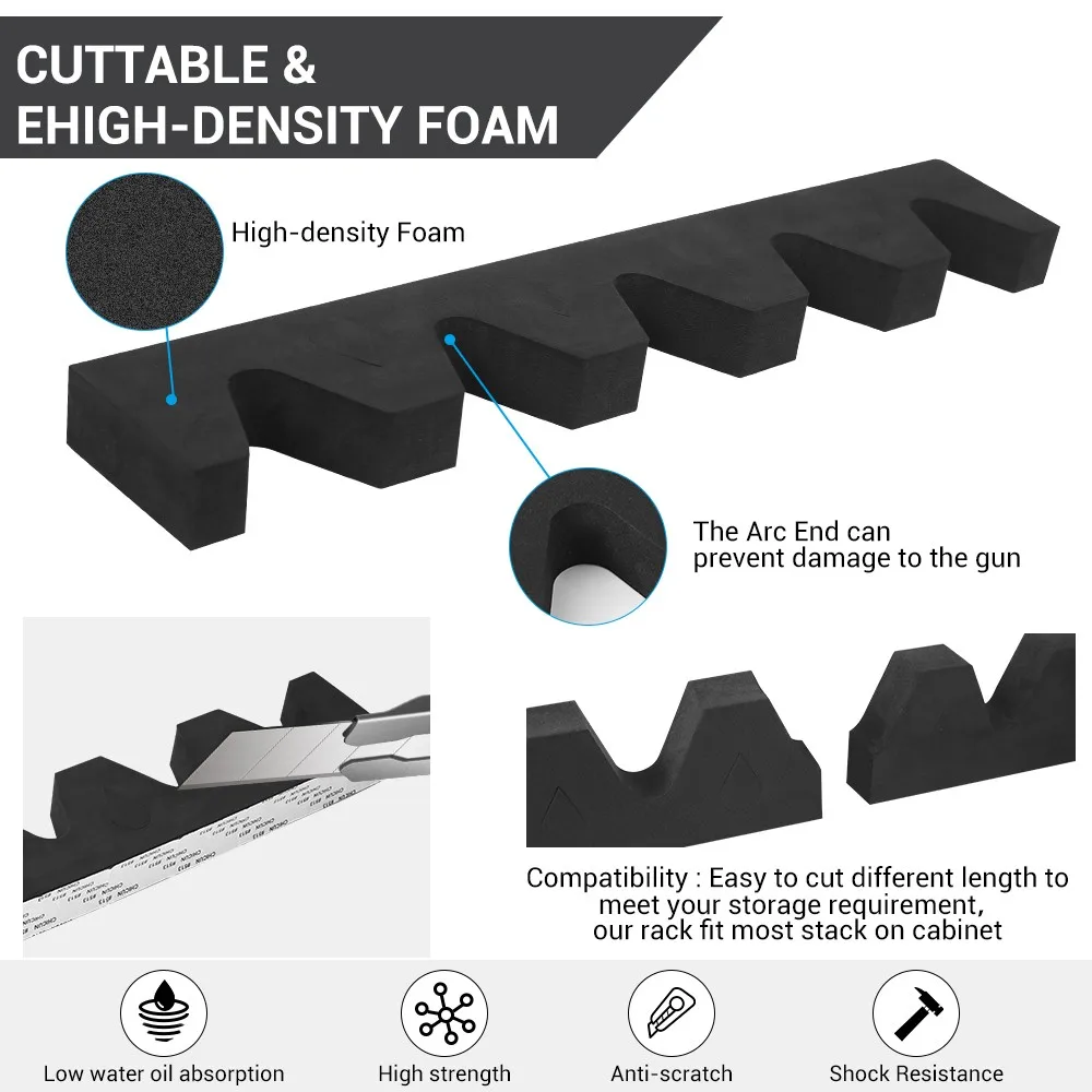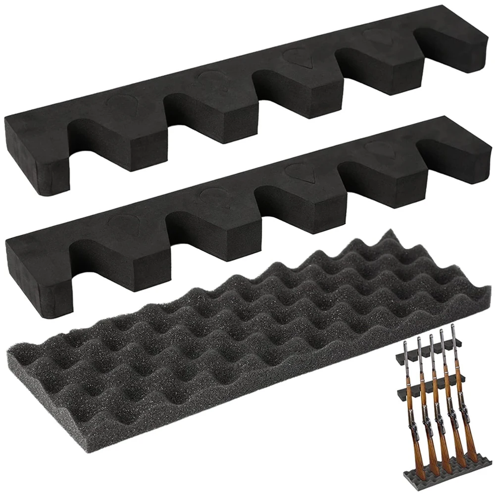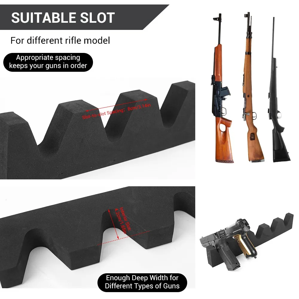 Espuma de alta densidad para brindar un buen soporte, para no dañar sus armas de fuego.Sin absorción de agua.Perfecto para uso en interiores y exteriores.La longitud del estante se puede cambiar para adaptarse al tamaño necesario con la ayuda de un cuchillo.