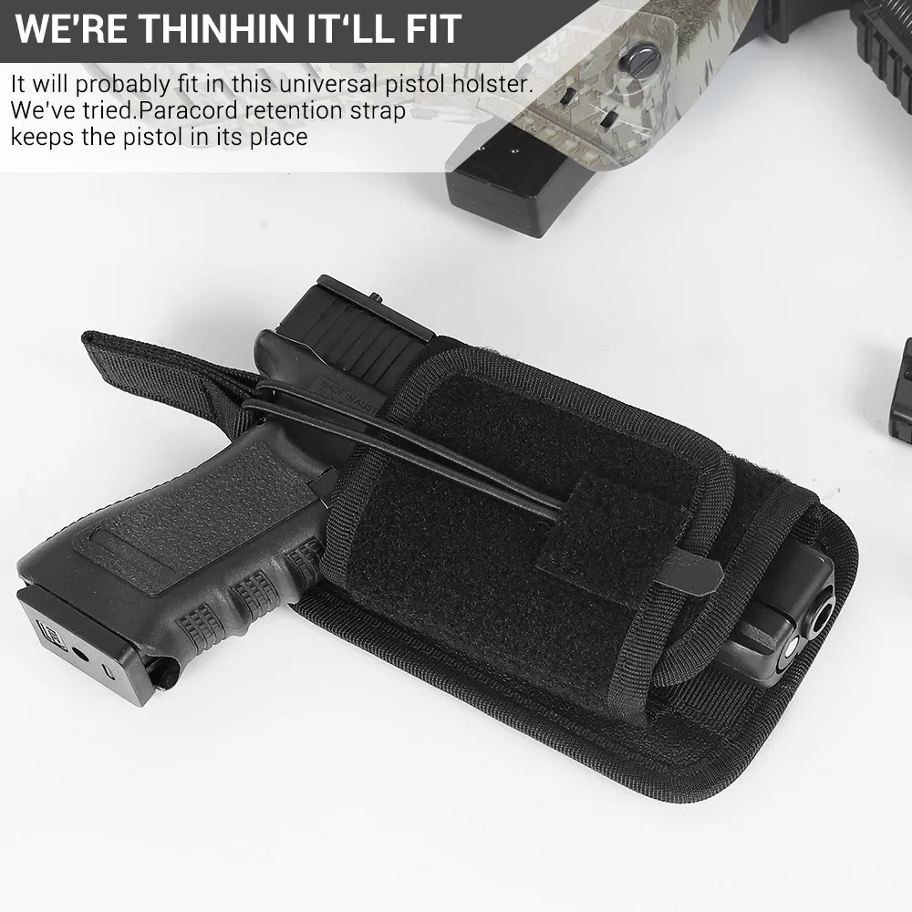 [Funda de pistola Universal]-se ajusta fácilmente a una pistola con RDS y linterna montada. La correa de retención Paracord lo mantiene en su lugar.