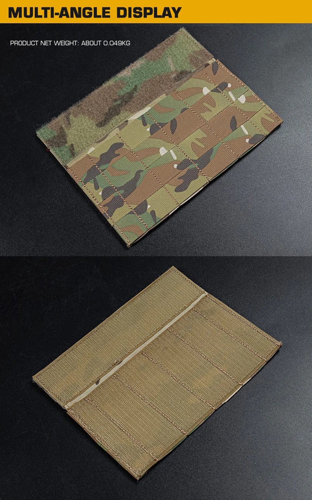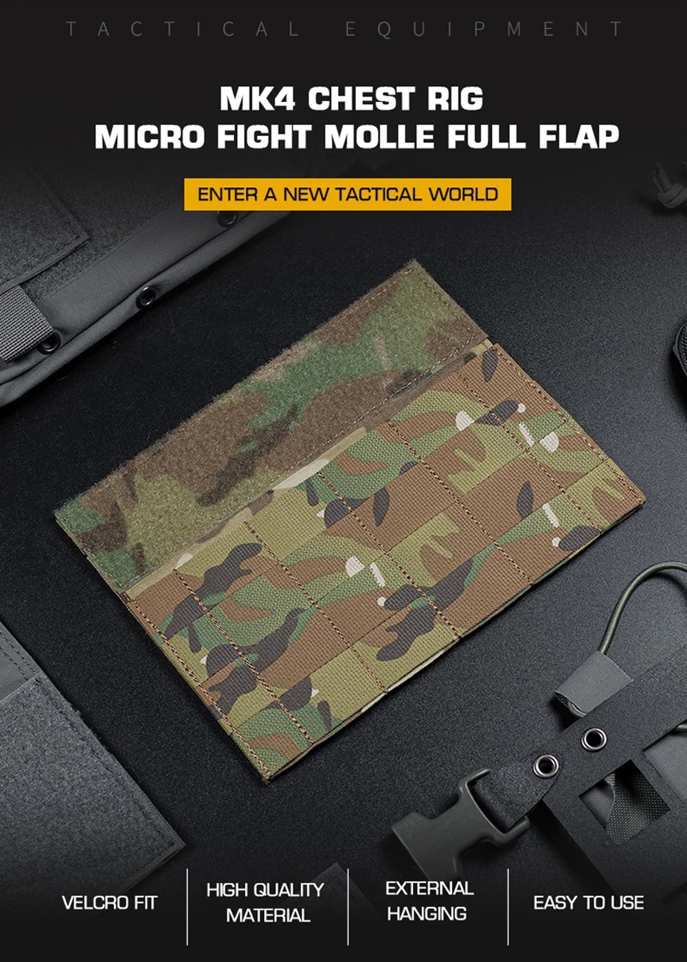 Nombre del producto: plataforma de pecho MK4 Micro Fight MOLLE solapa completa Número de artículo.:VE-74-ACC-06 Tamaño del producto: 16*19,8*0,3 cm Peso neto del producto: 0,049 kg Peso bruto del producto: 0,07 KG Color del producto: negro mate/gris lobo/verde Ranger/marrón coyote/multicam/multicam negro Material principal: tela Cordura. Escena aplicable: caza, deportes al aire libre y otros juegos tácticos de Airsoft, etc.