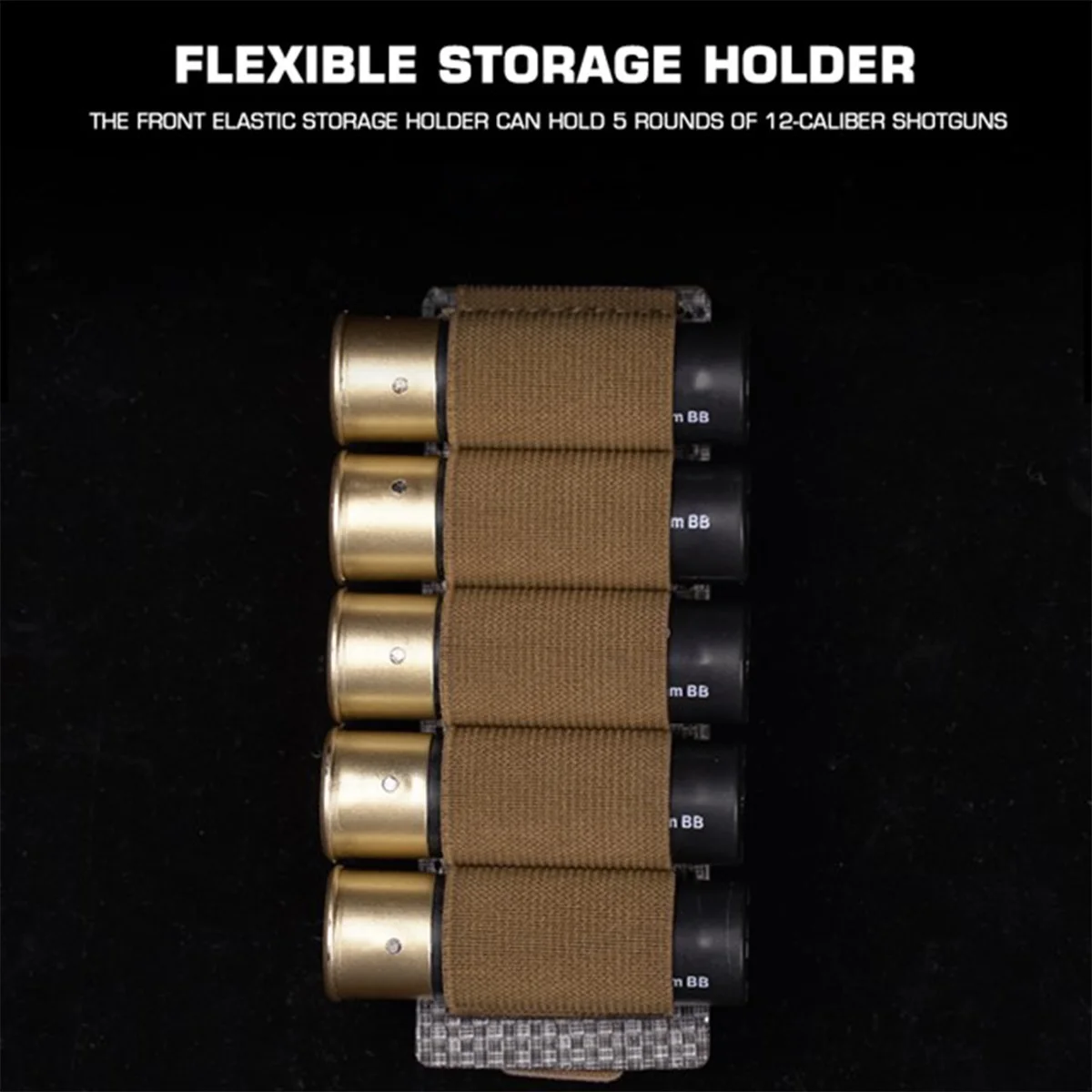 El soporte de almacenamiento elástico frontal puede contener 5 rondas de escopetas de calibre 12.