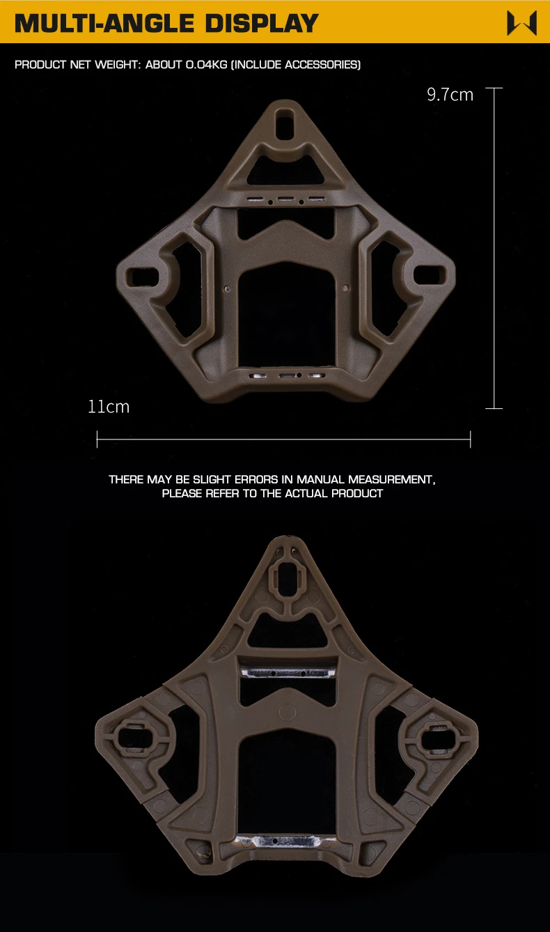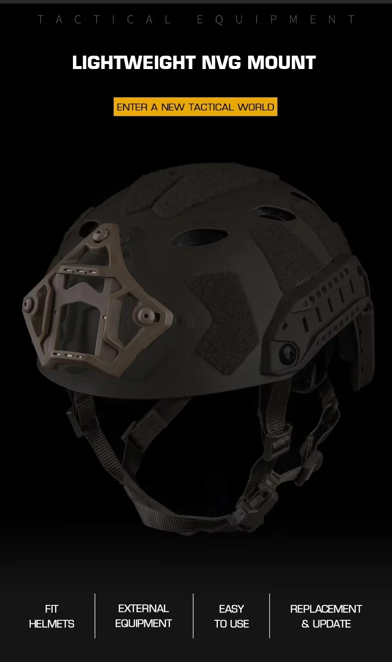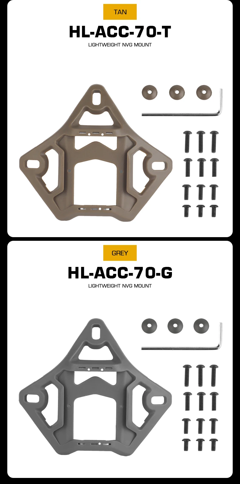 Soporte para casco NVG Compatible con cascos con base de montaje NVG ligera de 3 agujeros para WILCOX G19/G24/G30/G34/G69/G70 Información del producto Nombre del producto: soporte NVG ligero Artículo No.: HL-ACC-70 Material del producto: nailon. Color del producto: Negro/Gris/Verde/Tan Escena aplicable: Accesorios para casco