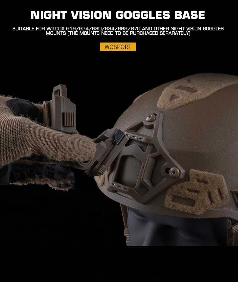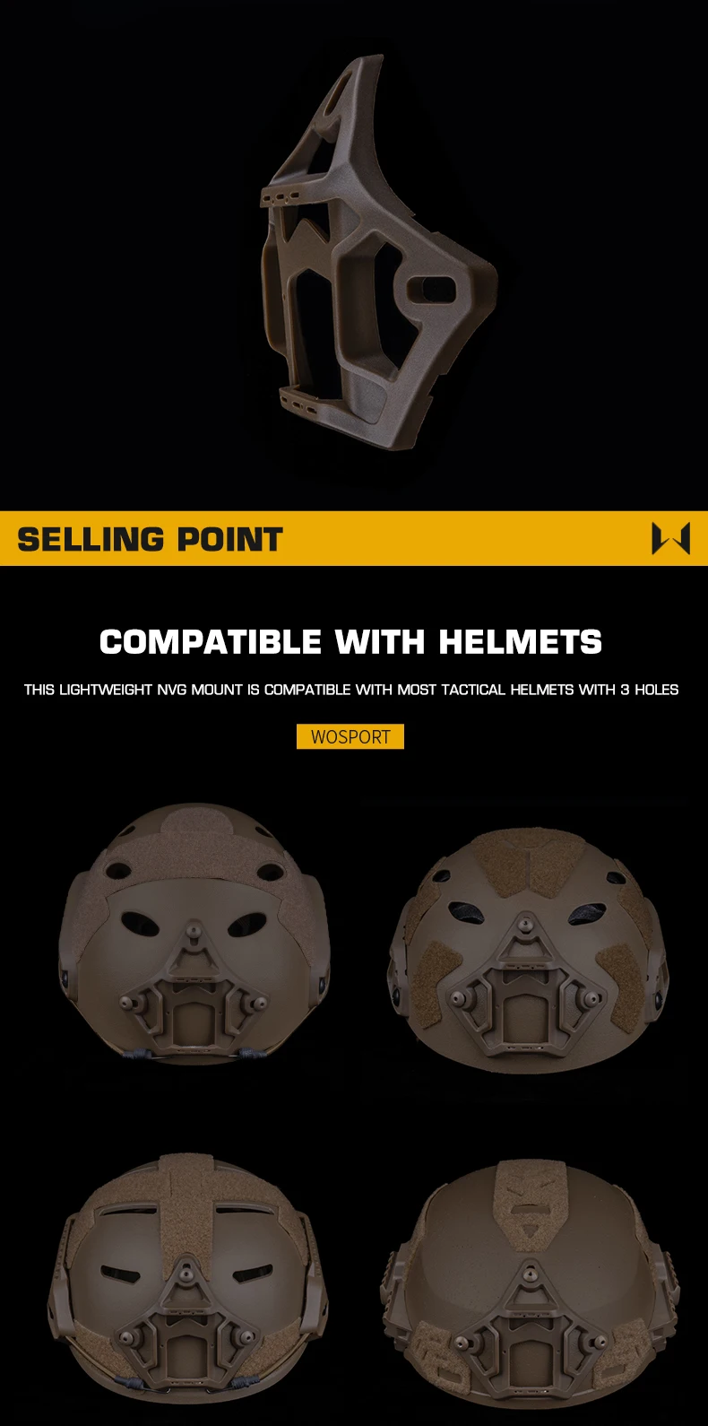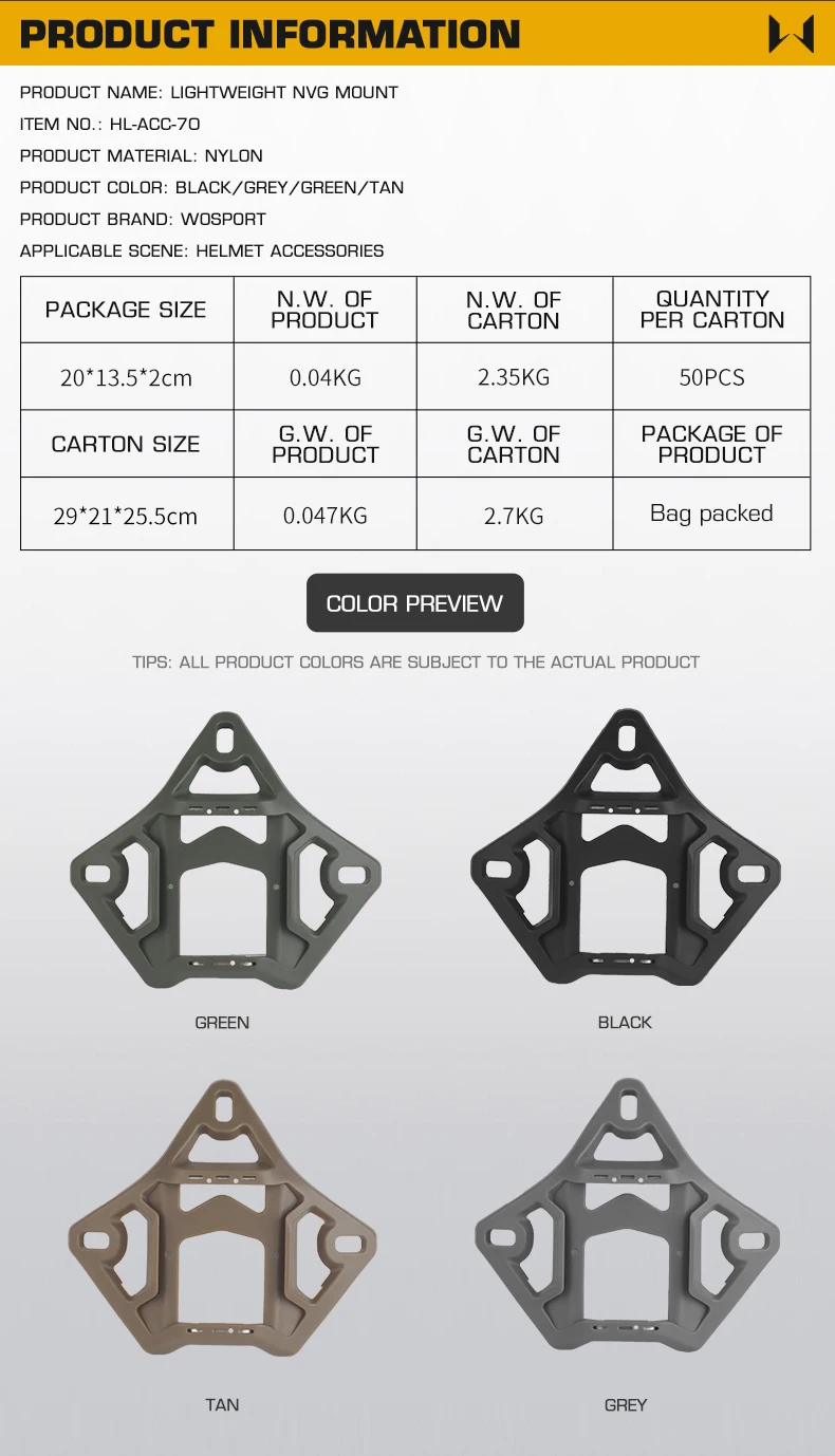Soporte para casco NVG Compatible con cascos con base de montaje NVG ligera de 3 agujeros para WILCOX G19/G24/G30/G34/G69/G70 Información del producto Nombre del producto: soporte NVG ligero Artículo No.: HL-ACC-70 Material del producto: nailon. Color del producto: Negro/Gris/Verde/Tan Escena aplicable: Accesorios para casco