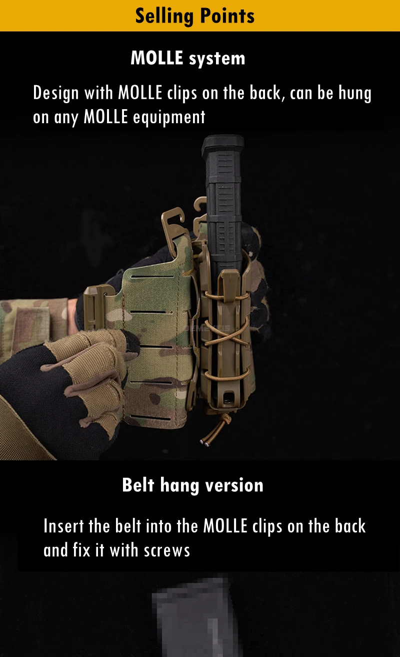 ● Versión para colgar el cinturón. Inserta el cinturón en los clips MOLLE en la parte posterior y fíjalo con tornillos.