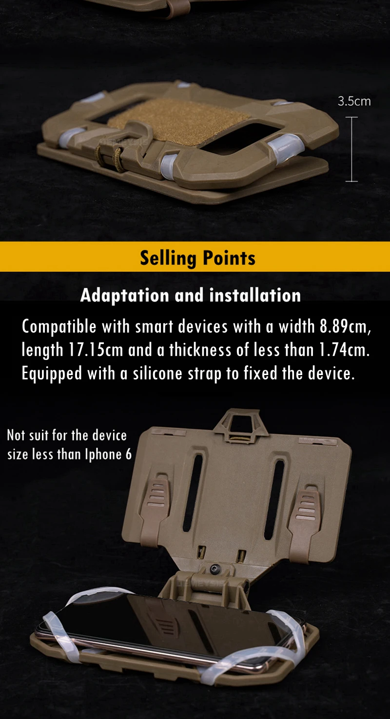 ● Hecho de material duradero, proporciona protección segura para su equipo de navegación y fija de forma segura su teléfono móvil en su equipo táctico MOLLE.