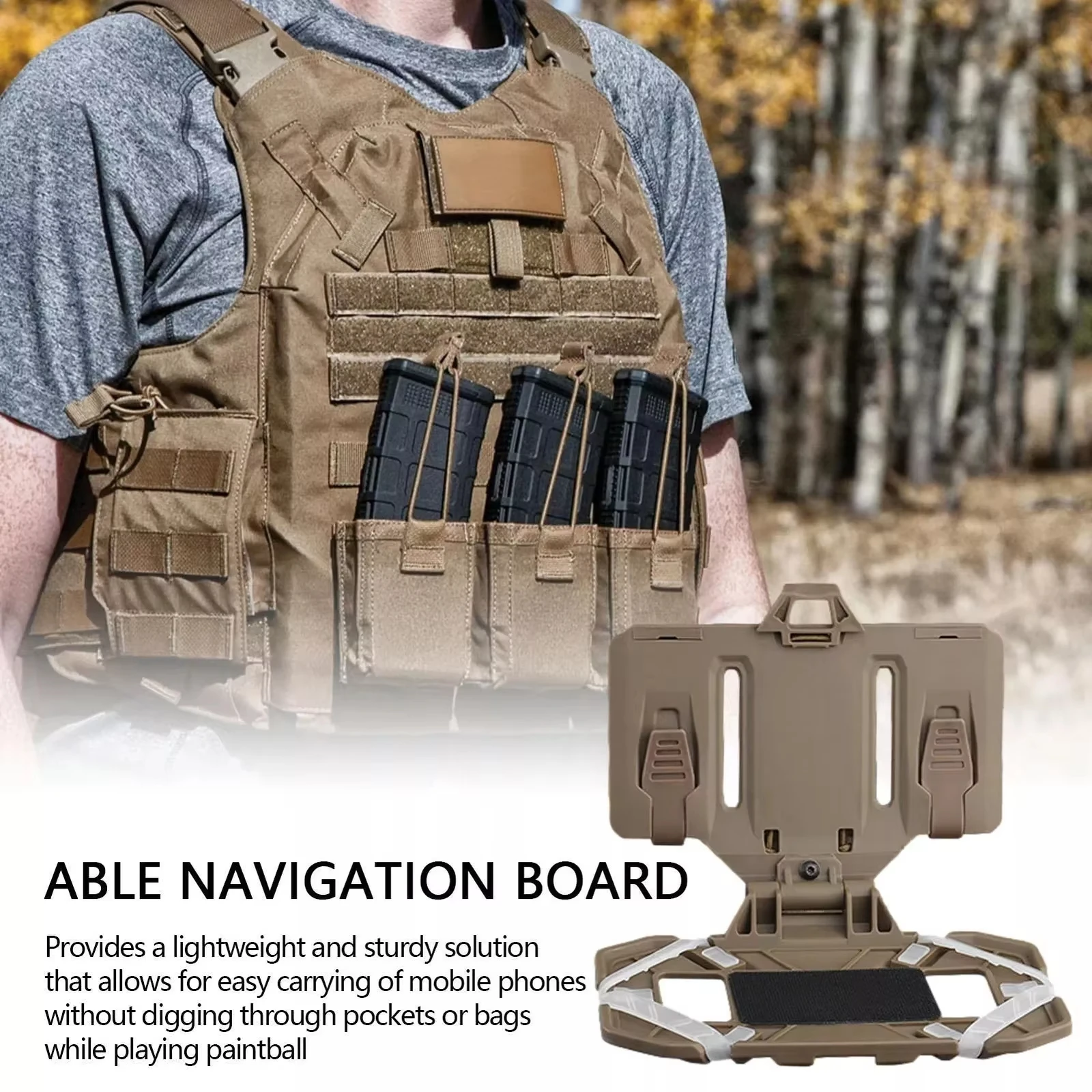 4.Soporte estilo chaleco: el soporte para placa telefónica se puede acoplar a un chaleco o mochila con correas MOLLE, lo que le brinda acceso rápido a su teléfono inteligente en todo momento.