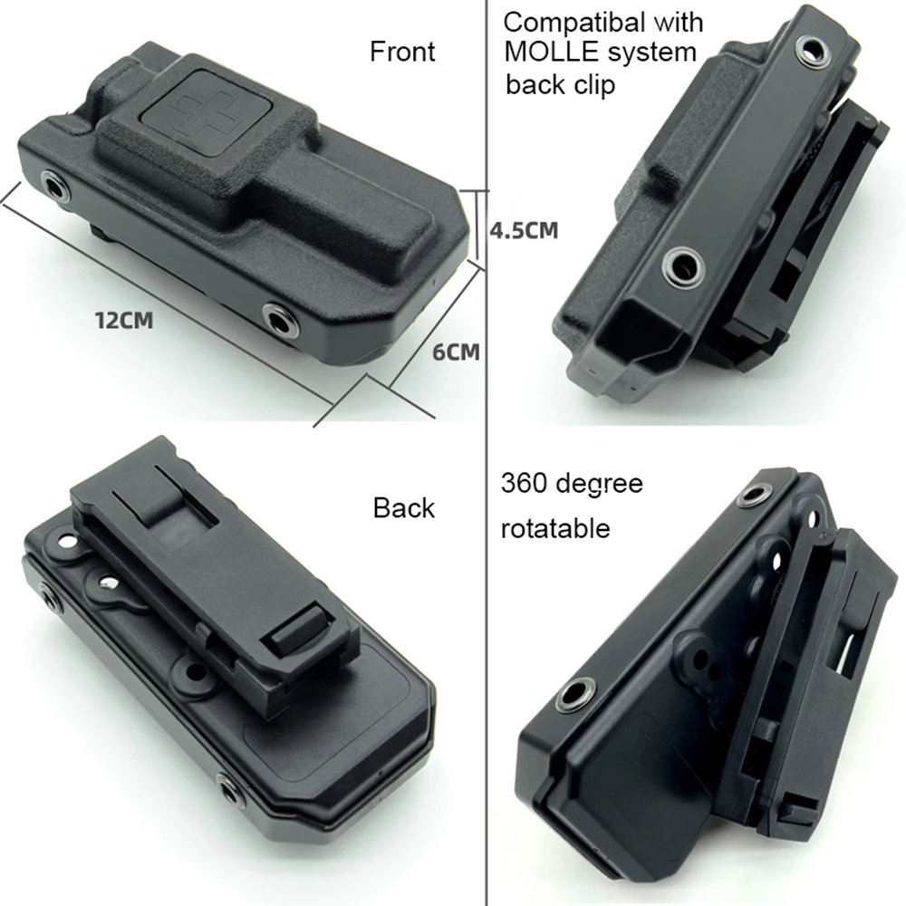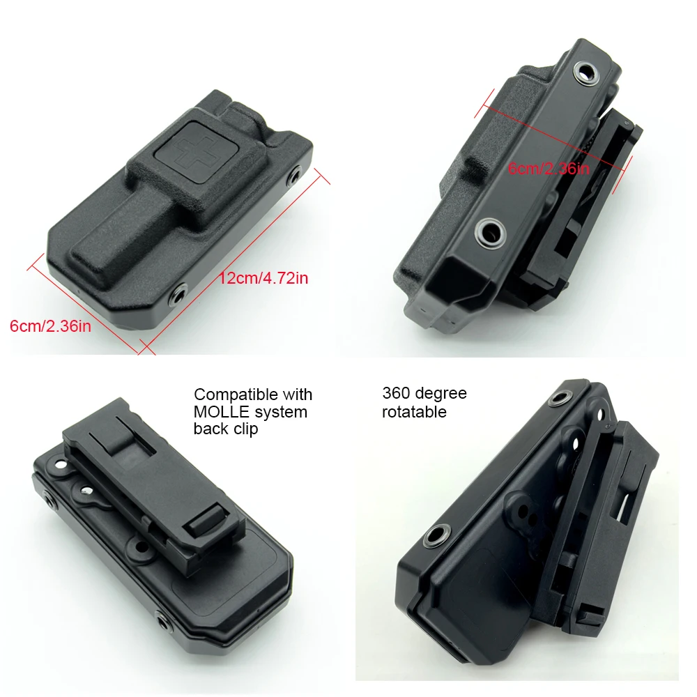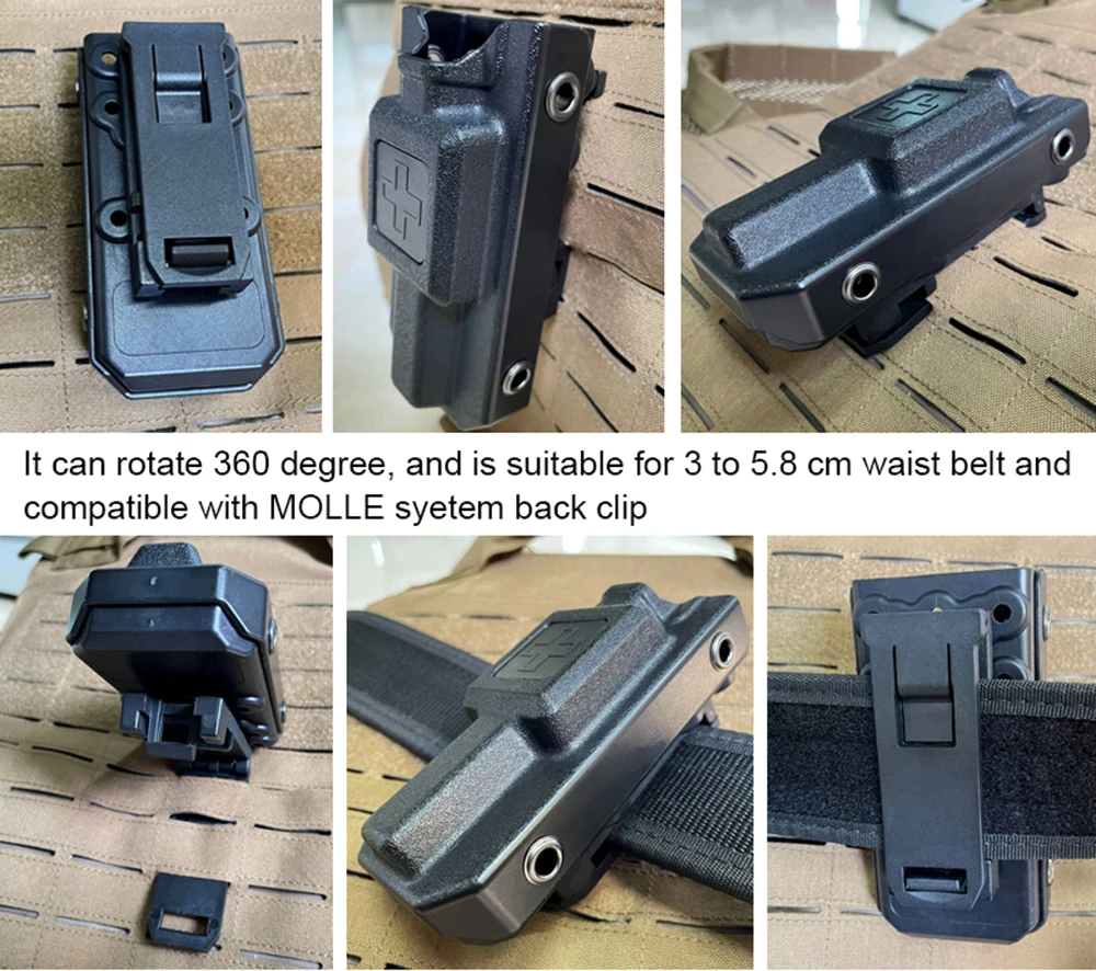 Puede girar 360 grados y es compatible con el clip trasero del sistema MOLLE.