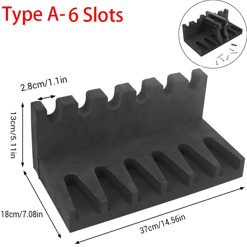 Tamaño del producto del soporte para pistola de 6 ranuras: 37 * 18 * 12,8 cm, peso 260 g.