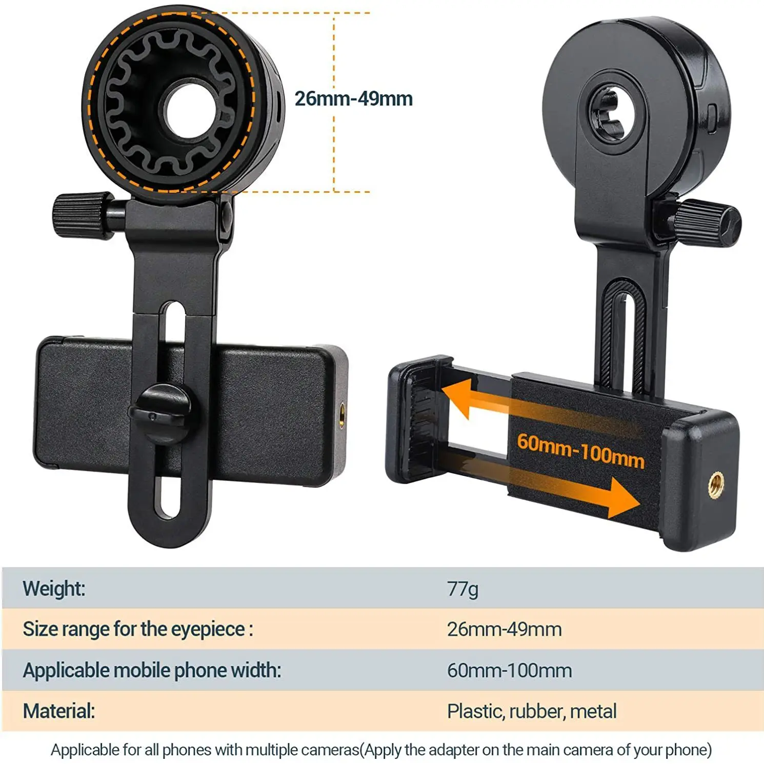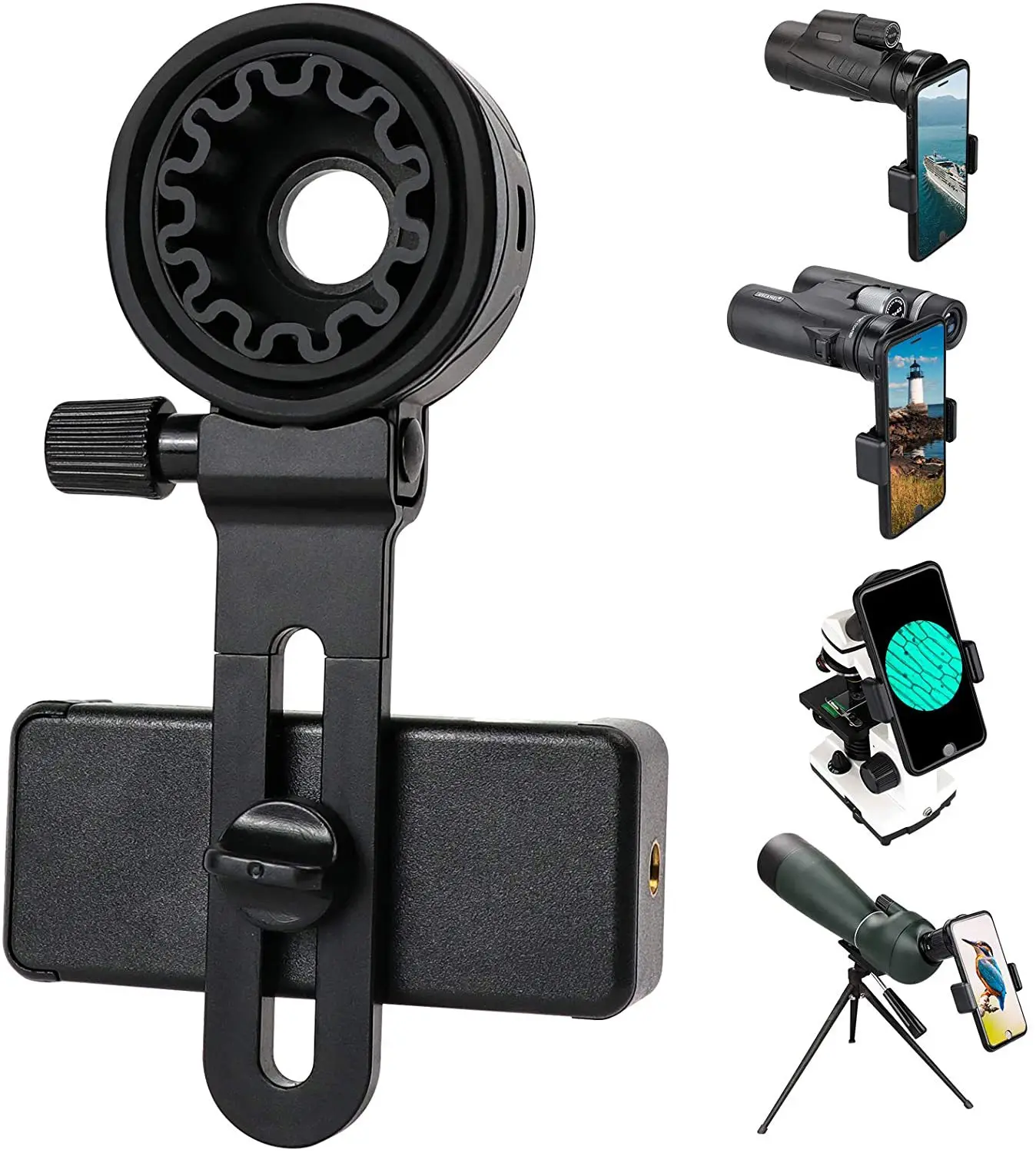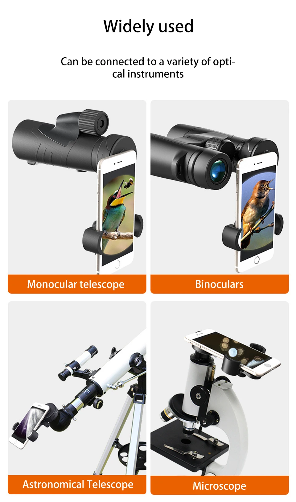 1. Este adaptador para teléfono inteligente conecta su teléfono inteligente a binoculares, binoculares, miras o microscopios, y lleva su teléfono móvil a cámaras de video del mundo pequeño y imágenes de lupa.Explora la naturaleza del mundo fácilmente a través de la pantalla.