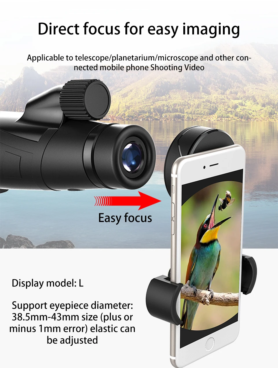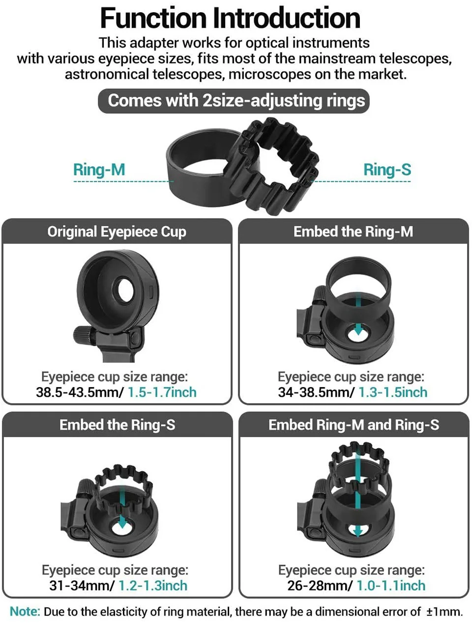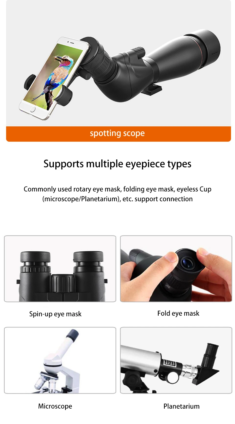 1. Este adaptador para teléfono inteligente conecta su teléfono inteligente a binoculares, binoculares, miras o microscopios, y lleva su teléfono móvil a cámaras de video del mundo pequeño y imágenes de lupa.Explora la naturaleza del mundo fácilmente a través de la pantalla.