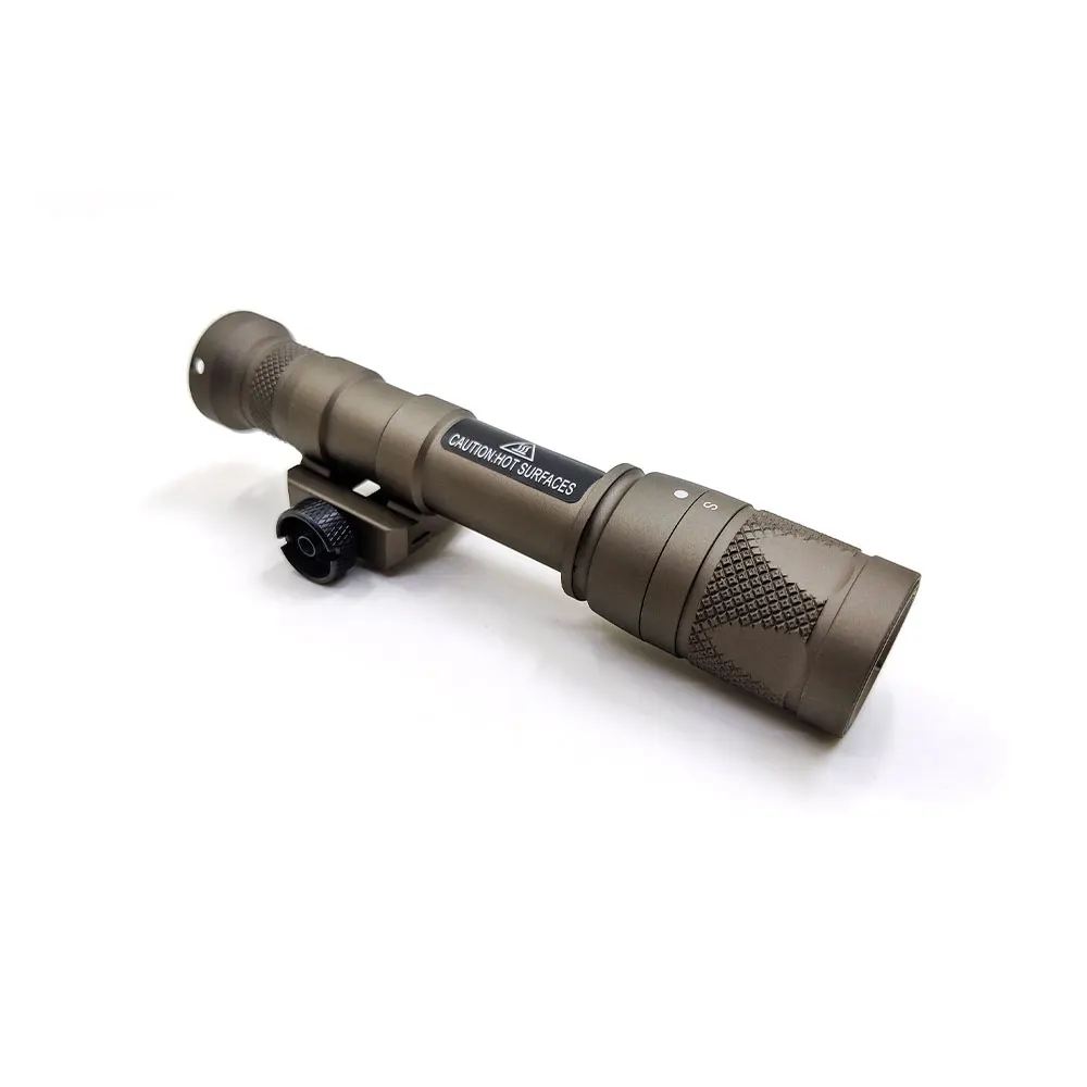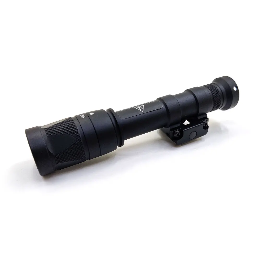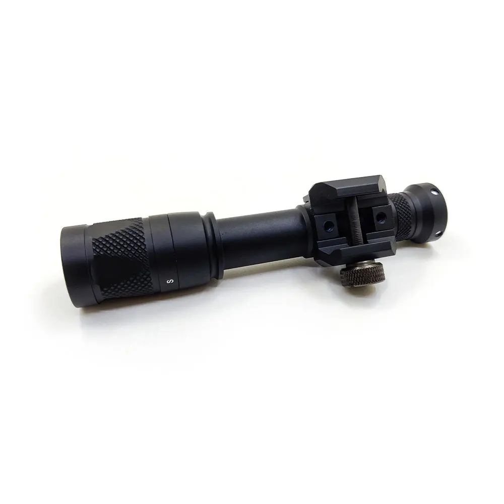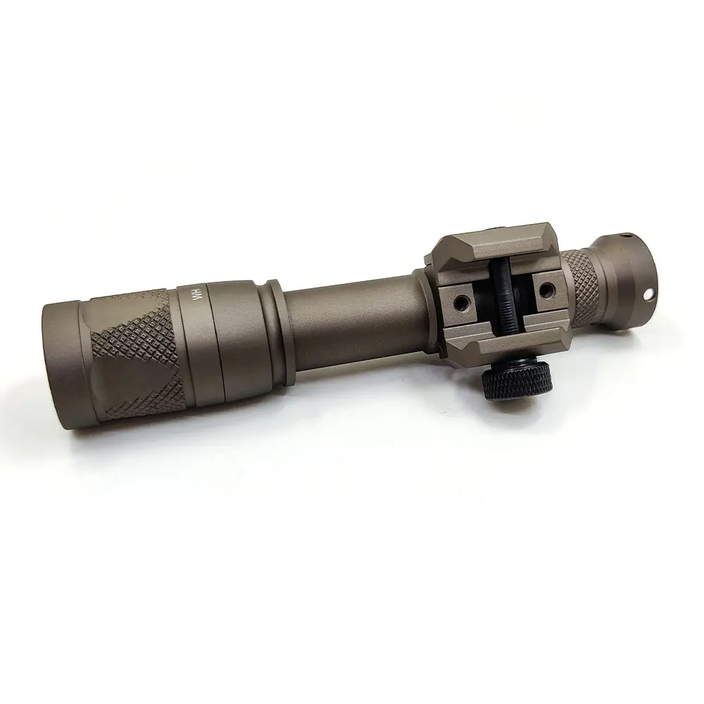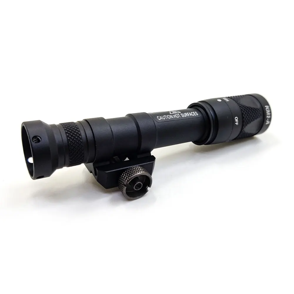 4. La robusta linterna M600V se sujeta de forma fácil y segura a los rieles a través de su abrazadera de tornillo de mariposa integral y se activa haciendo clic en el interruptor de la tapa trasera del botón.