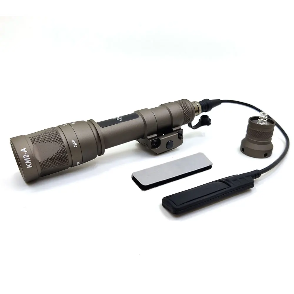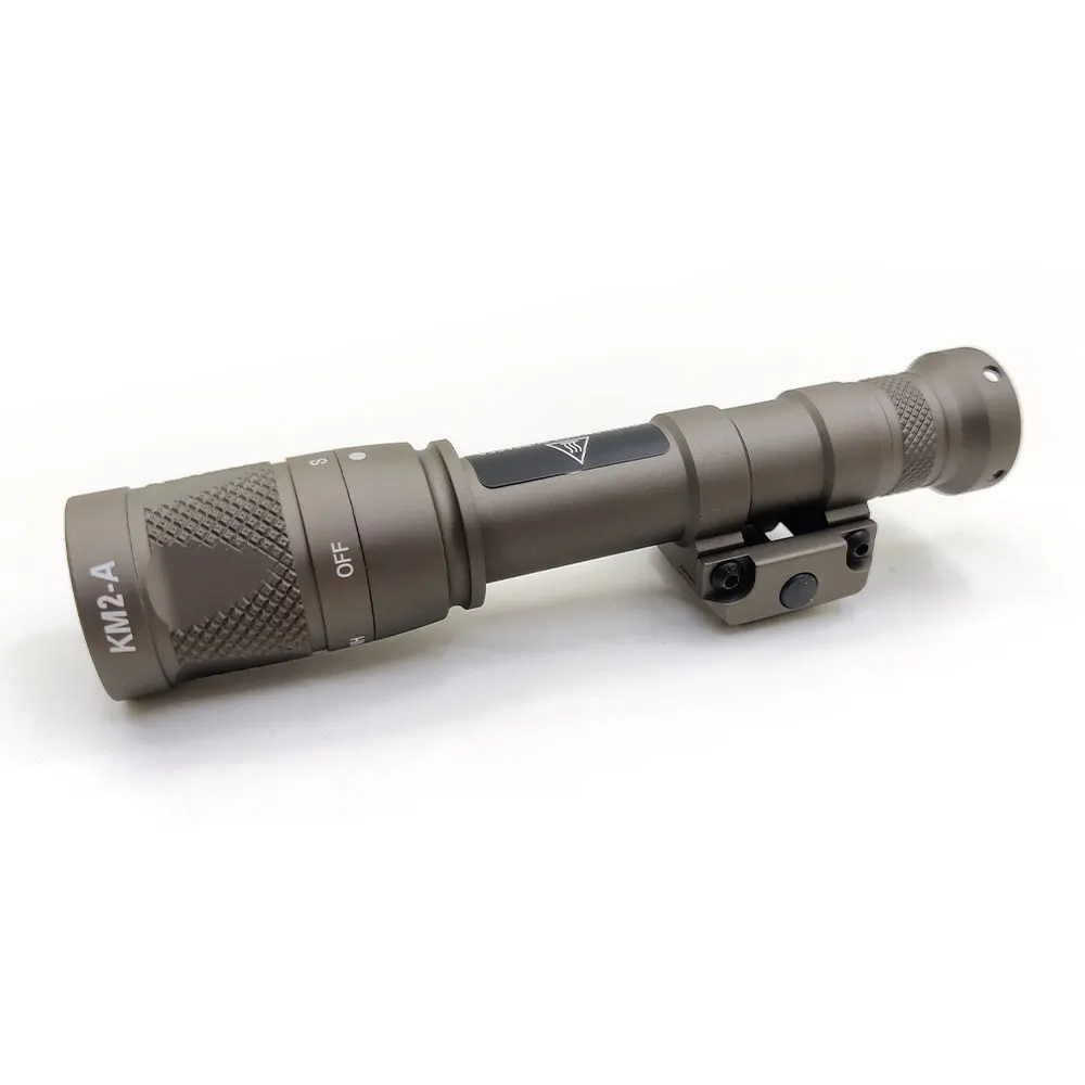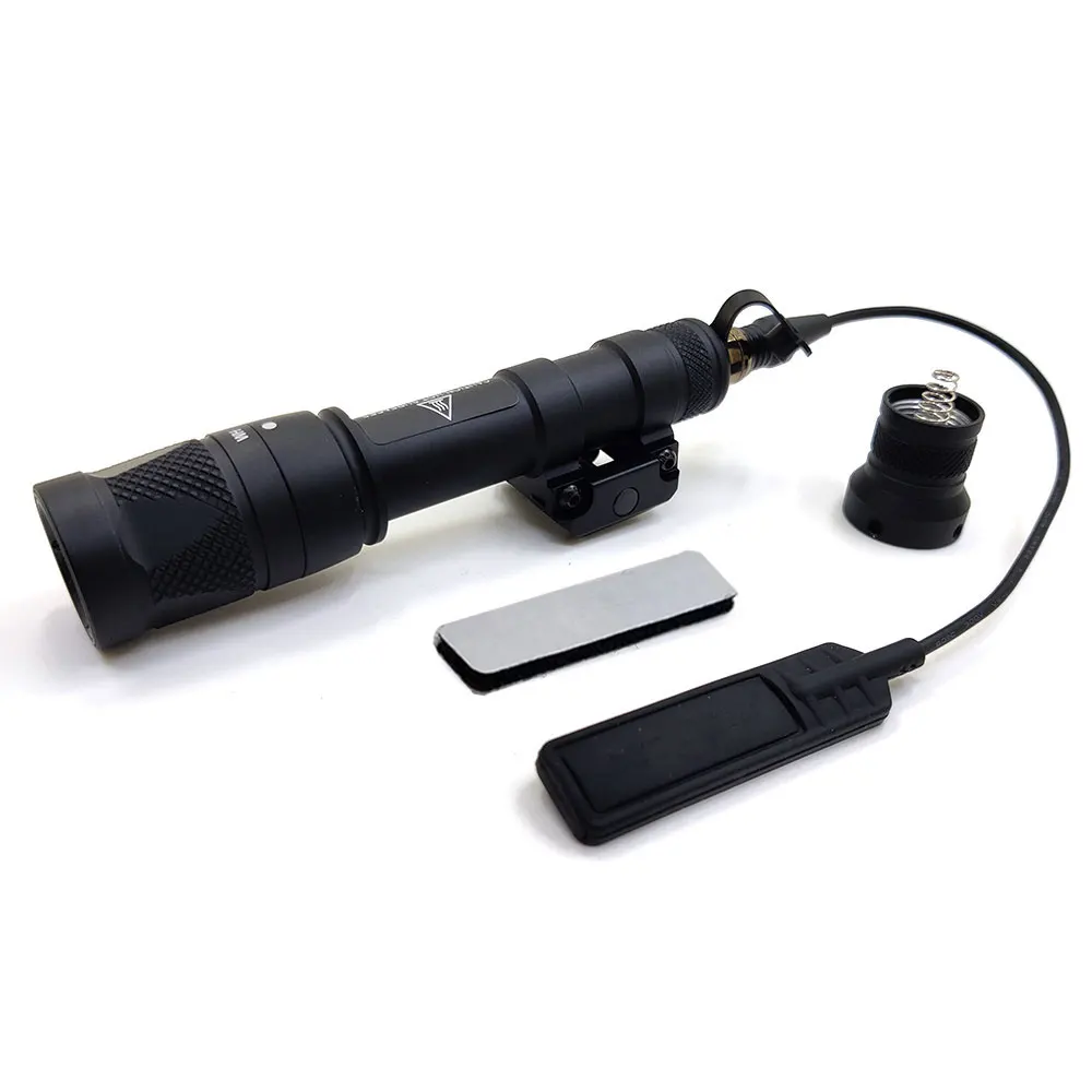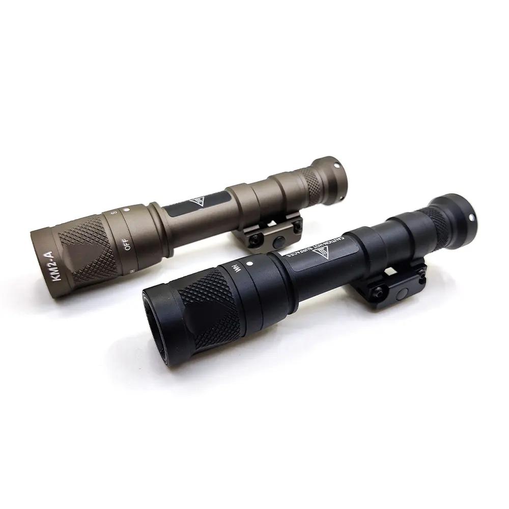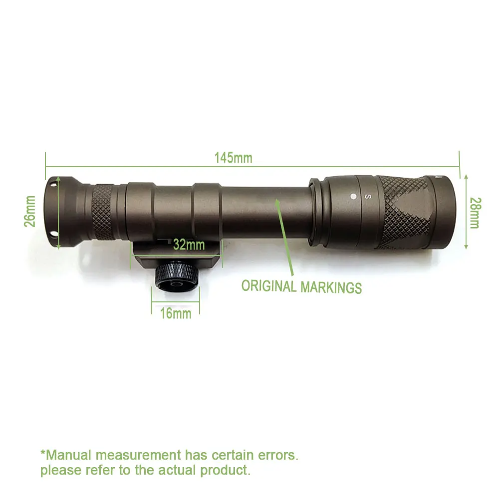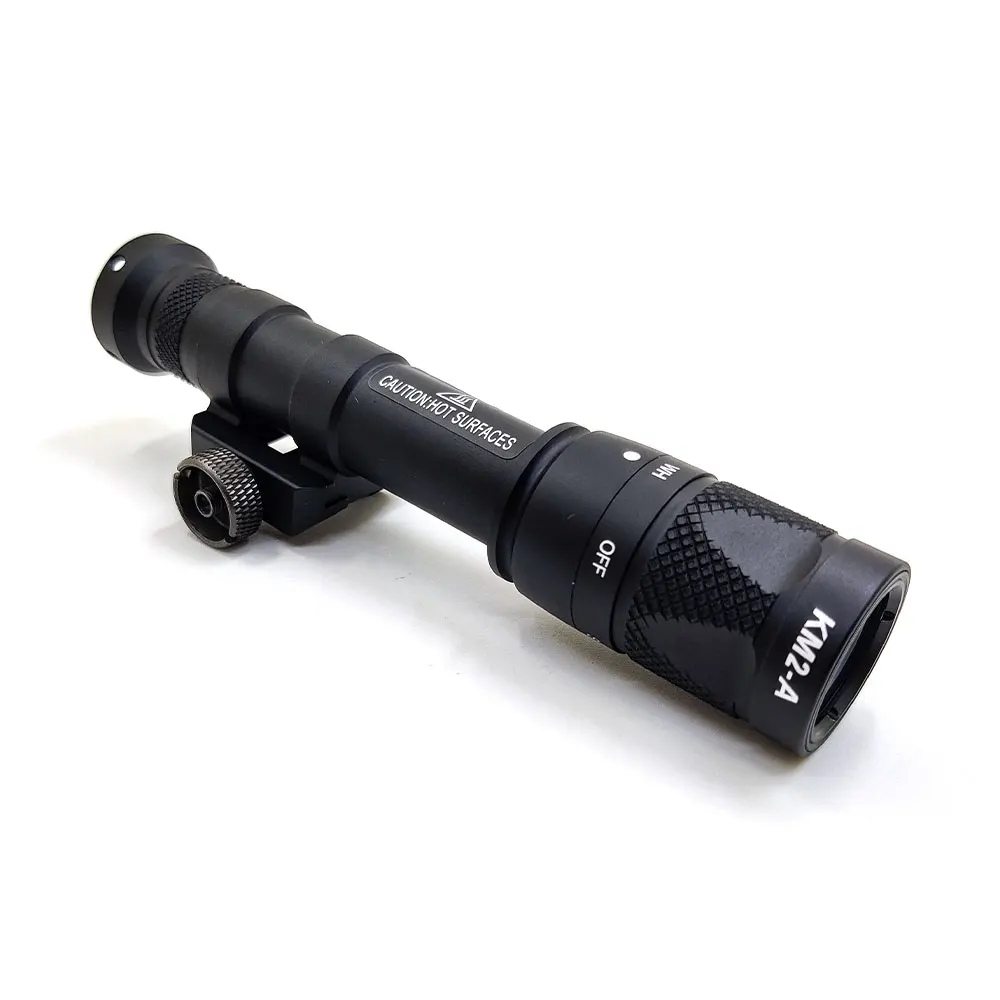4. La robusta linterna M600V se sujeta de forma fácil y segura a los rieles a través de su abrazadera de tornillo de mariposa integral y se activa haciendo clic en el interruptor de la tapa trasera del botón.