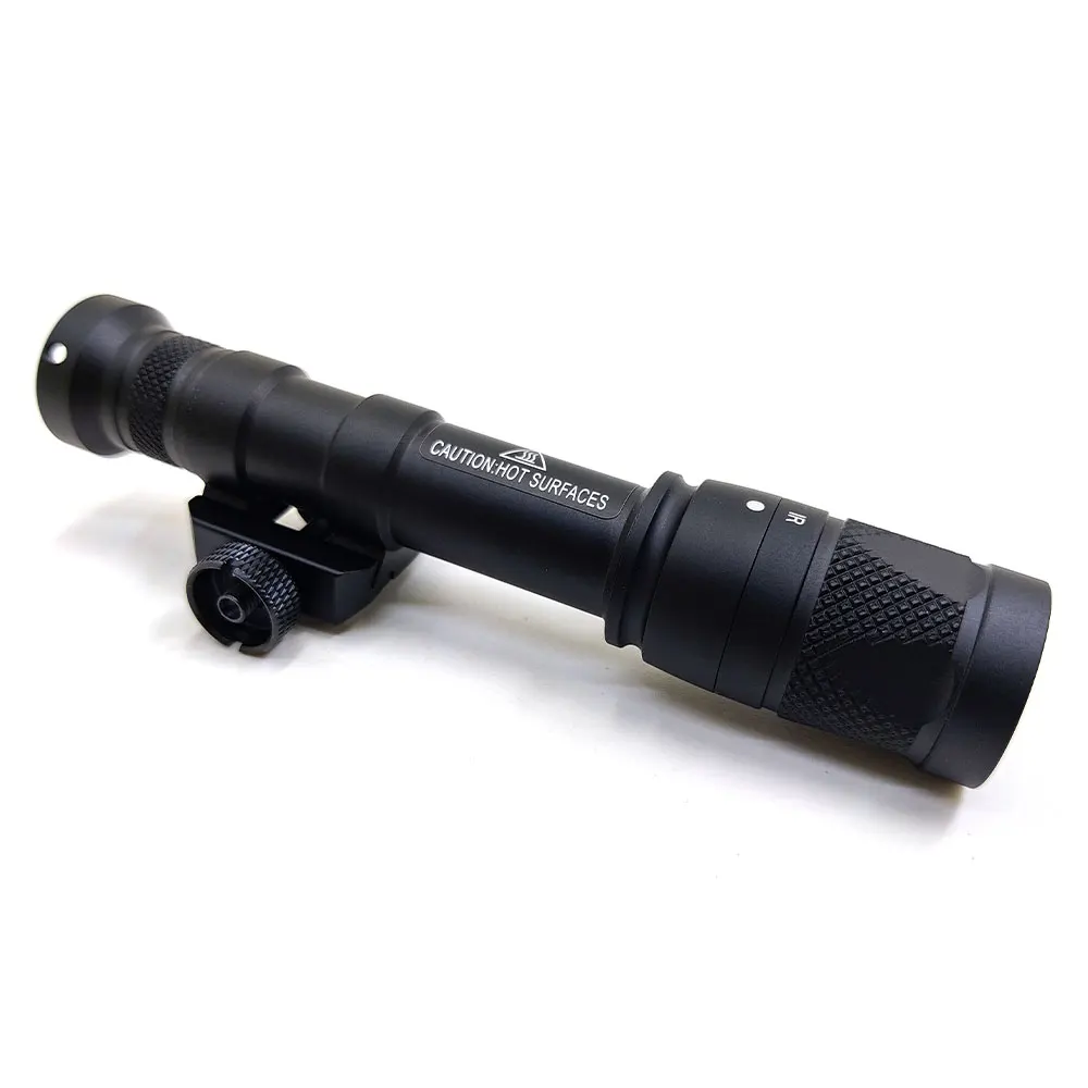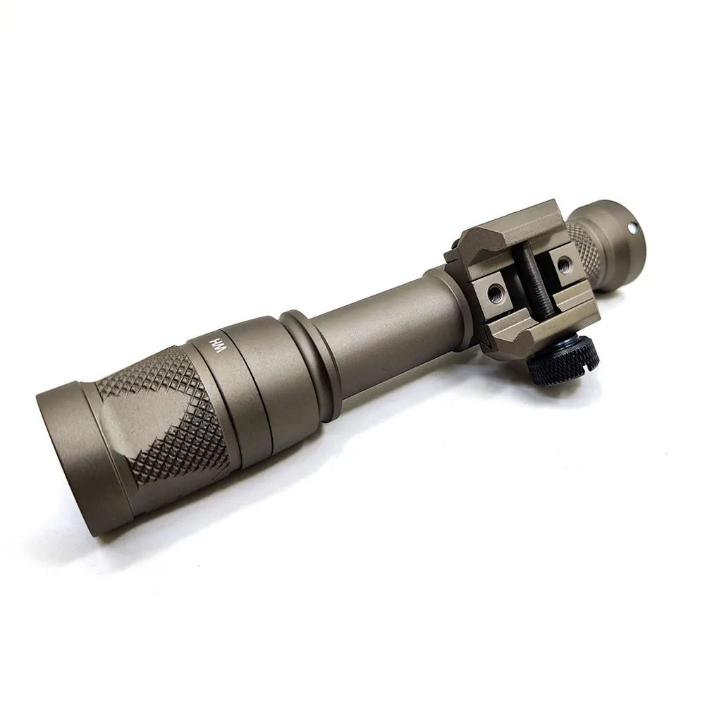 4. La robusta linterna M600V se sujeta de forma fácil y segura a los rieles a través de su abrazadera de tornillo de mariposa integral y se activa haciendo clic en el interruptor de la tapa trasera del botón.