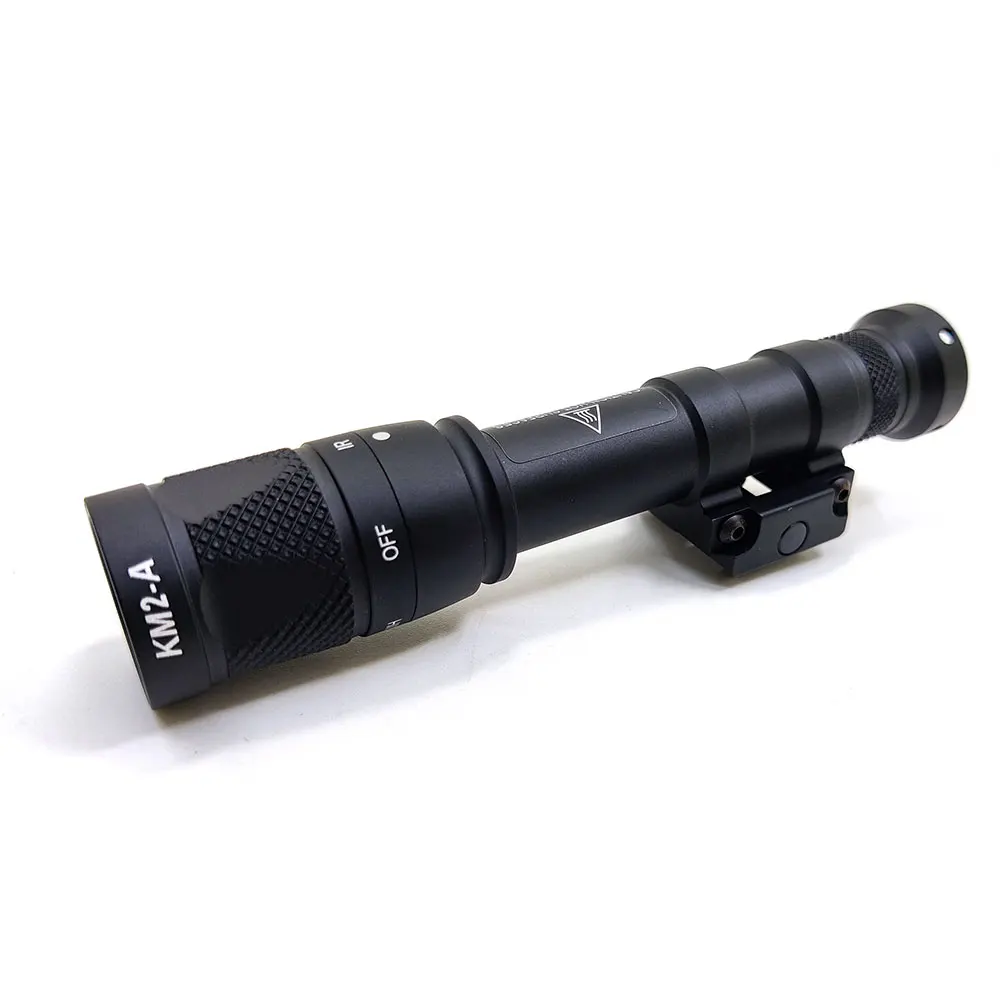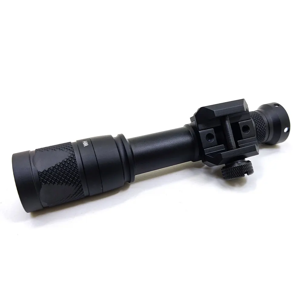4. La robusta linterna M600V se sujeta de forma fácil y segura a los rieles a través de su abrazadera de tornillo de mariposa integral y se activa haciendo clic en el interruptor de la tapa trasera del botón.