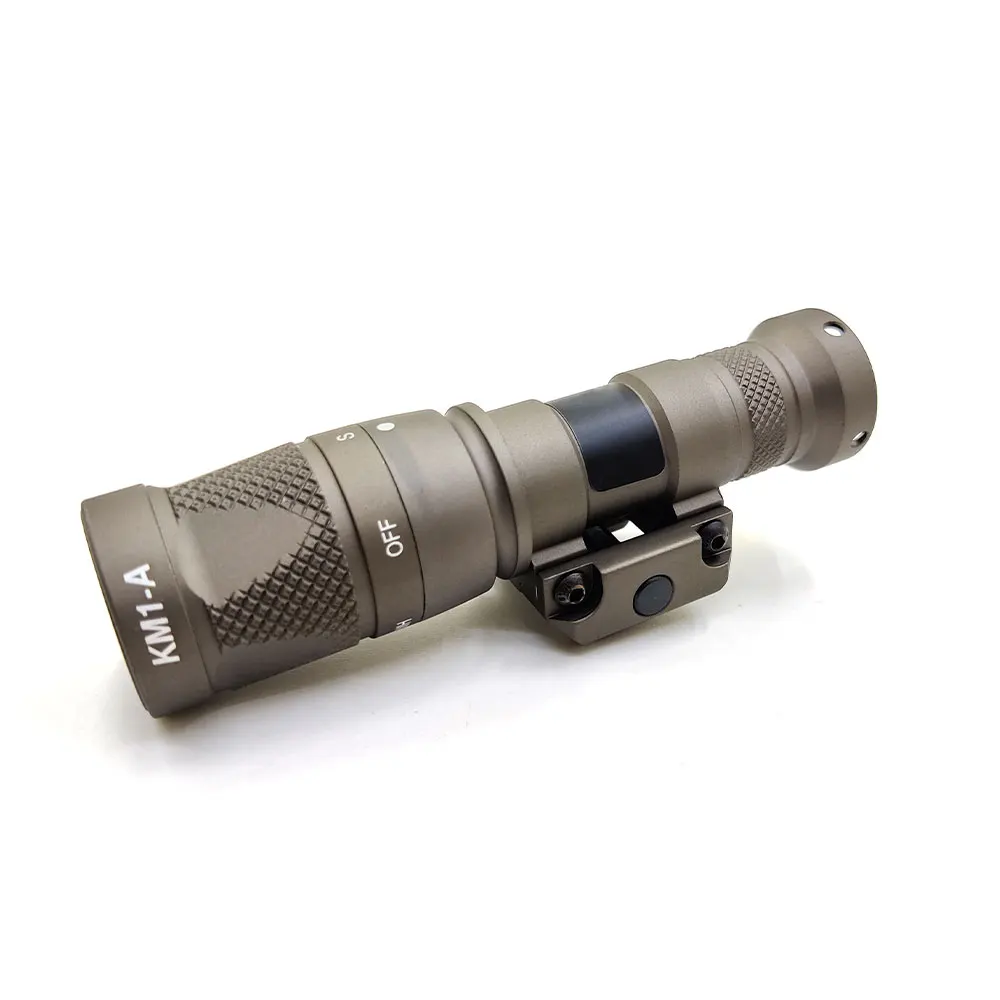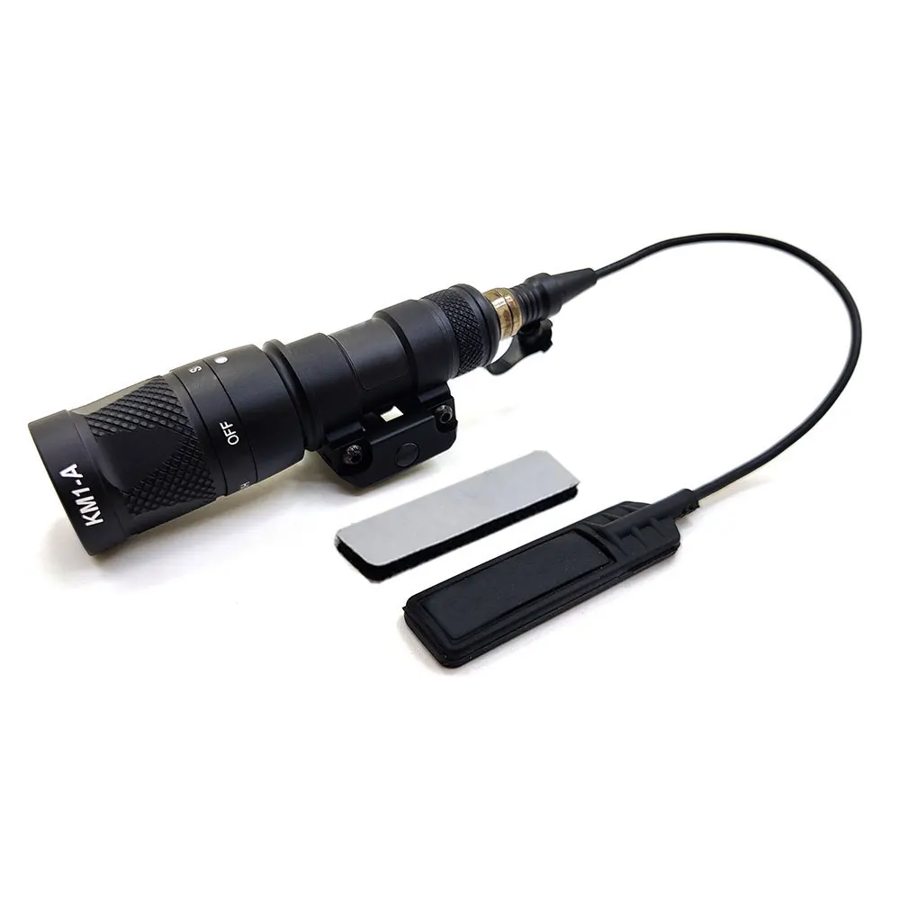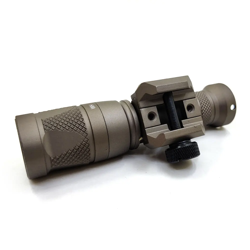 4. La resistente linterna M300V se fija de forma fácil y segura a los rieles a través de su abrazadera de tornillo de mariposa integral y se activa haciendo clic en el interruptor de la tapa trasera del botón.