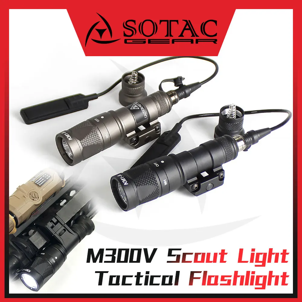 4. La resistente linterna M300V se fija de forma fácil y segura a los rieles a través de su abrazadera de tornillo de mariposa integral y se activa haciendo clic en el interruptor de la tapa trasera del botón.