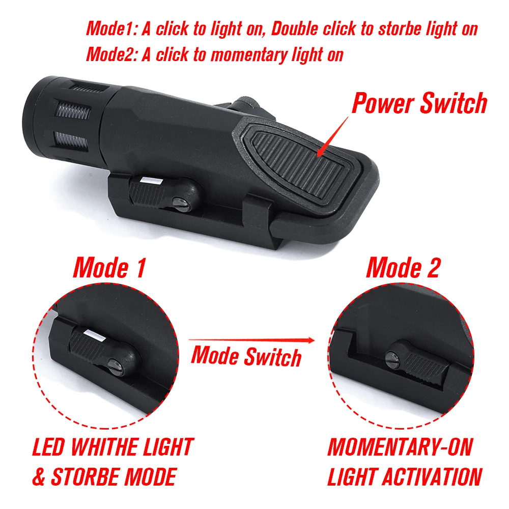 Se monta en rieles de 20mm con clips (se puede asegurar con un dial horizontal), el botón de irradiación está diseñado para ser fácil de presionar en cualquier posición de pistola.