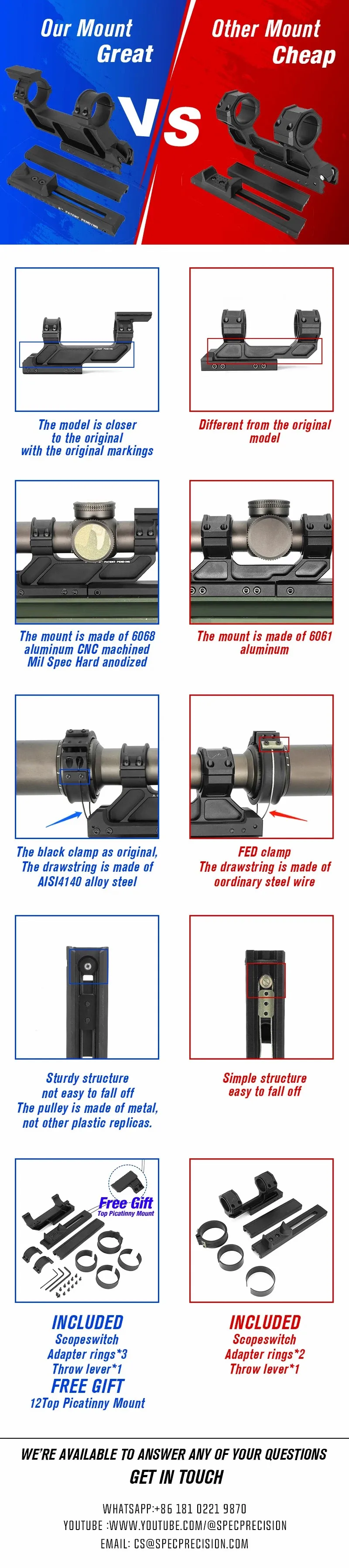 El soporte está hecho de aluminio 6068 mecanizado CNC, mientras que los cables están hechos de acero de aleación AISI 4140, que se compone principalmente de acero de cromo-molibdeno de alta resistencia. Presenta una combinación equilibrada de alto contenido de carbono, resistencia, tenacidad, resistencia al desgaste, resistencia al impacto y tratabilidad térmica.