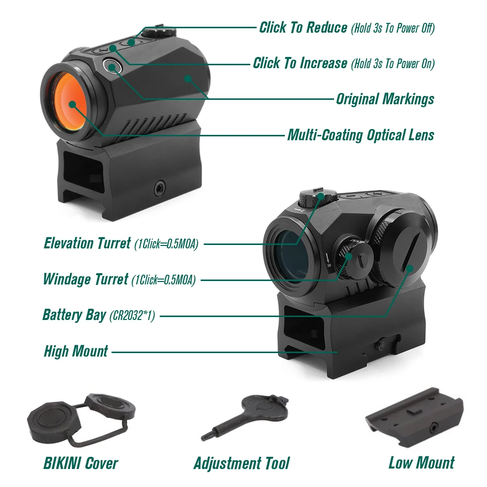 2 MOA Red-Dot proporcionan 10 ajustes de iluminación (8 de luz diurna más 2 NV) para visibilidad en todas las condiciones de luz