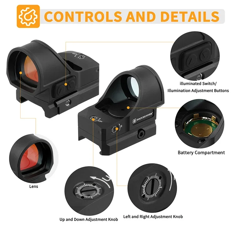 The FOCUHUNTER is equipped with a clear 3 MOA dot in either red and 10 manual illumination settings, The FOCUHUNTER stays at the ready longer with a topmost-mounted CR1632 battery and Shake F' Wake auto on/off. Brightness settings 1 and 2 are night vision-compatible with settings 3 to 8 for low-light and indoor applications, leaving settings 9 and 10 ideal for daylight shooting.