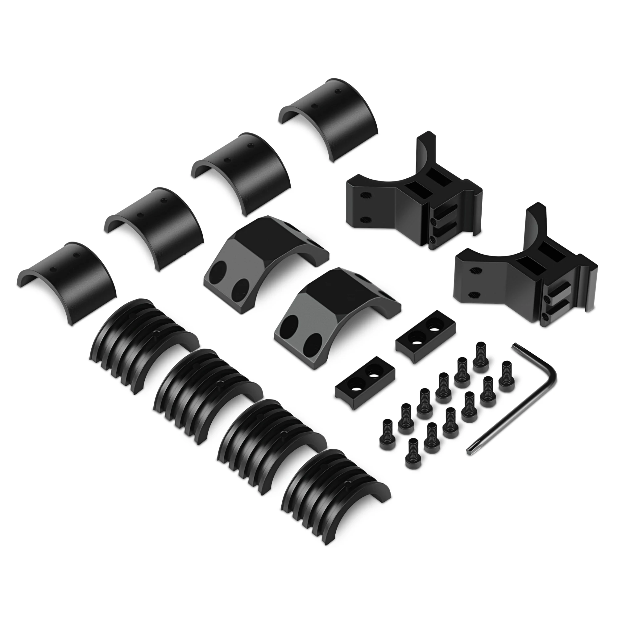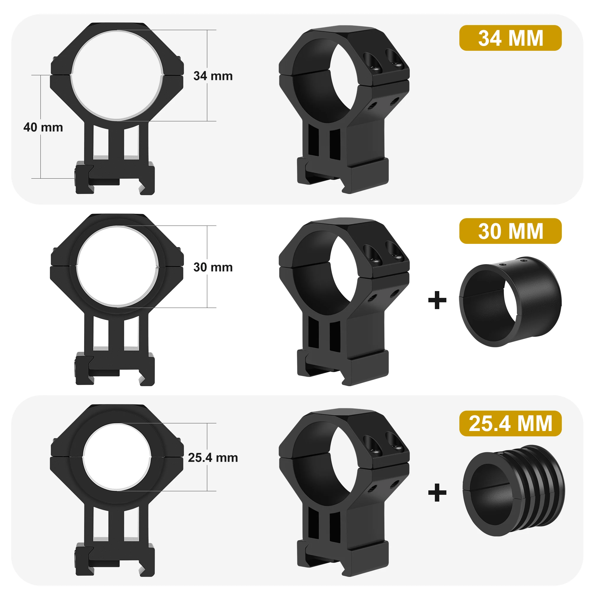 Todo material de aluminio. Tres en uno anillos de alcance. Adecuado para tres tamaños: 25,4mm, 30mm y 34mm.