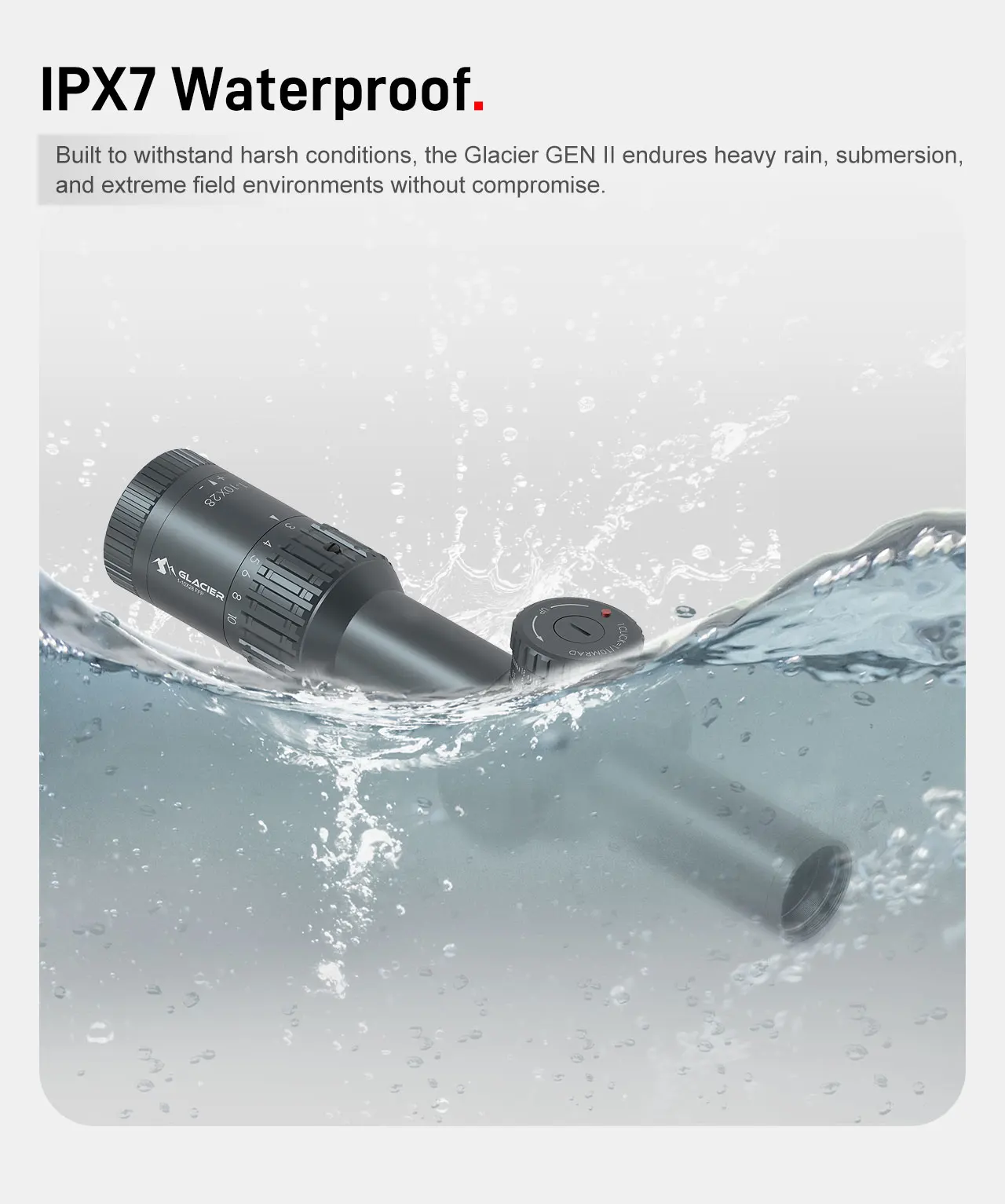 Resistente al agua y a la niebla según los estándares IPX7:Purificado con nitrógeno y sellado con múltiples juntas tóricas, puede resistir la inmersión, está completamente protegido contra el empañamiento interno y los hongos y funciona en temperaturas extremas de -30°C a 60°C.