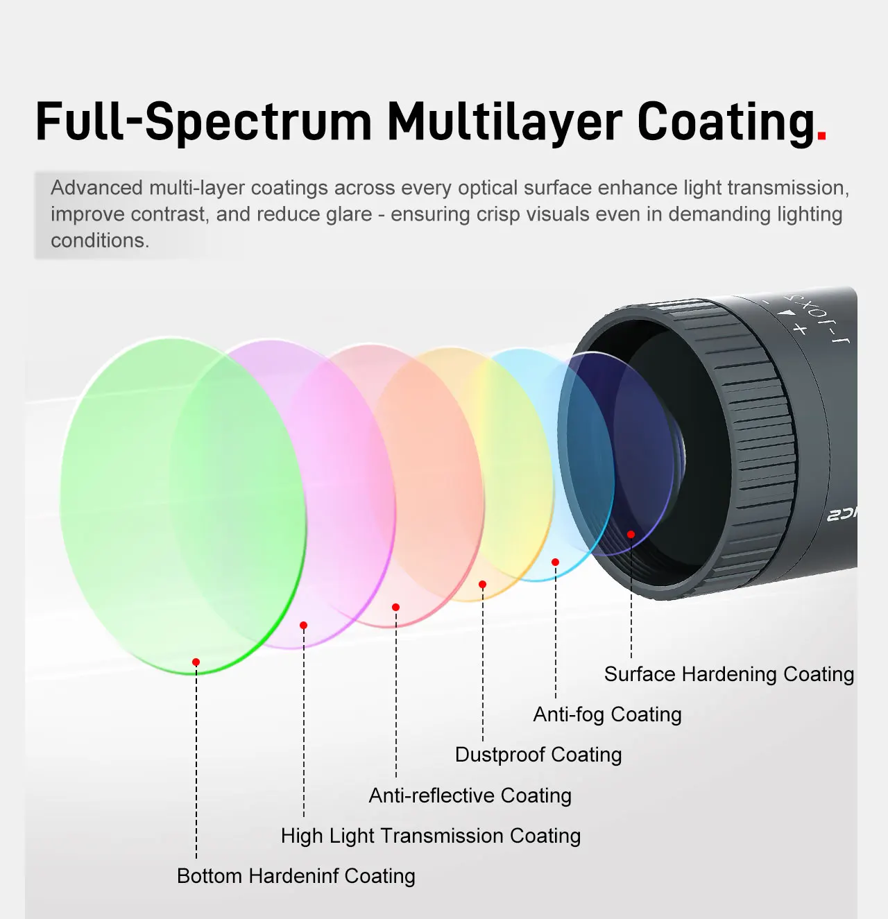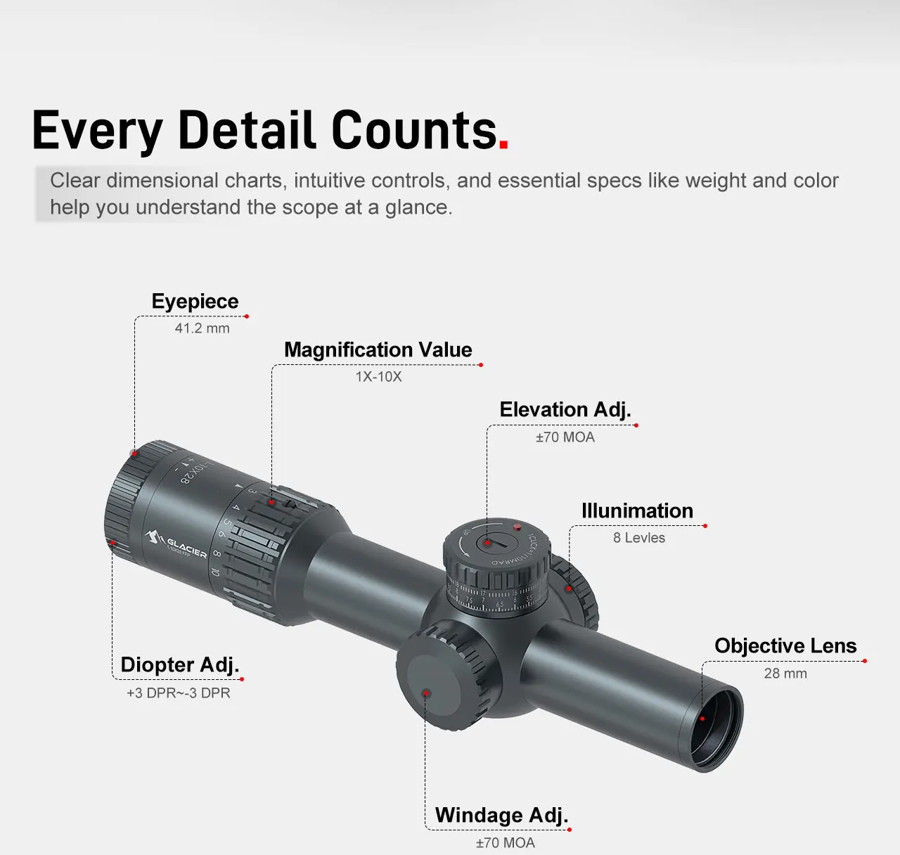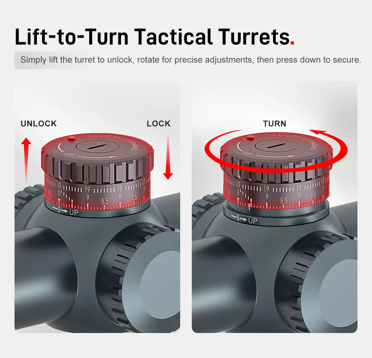 Sistema de torreta revolucionario:ElParada cero con anillo contador de revoluciónpermite a los tiradores volver a cero con precisión y rapidez, evitando ajustes accidentales.Junto con el mecanismo de parada cero "Lift-to-Unlock, Press-to-Lock", permite cambiar instantáneamente entre participación cercana y incendio de precisión de largo alcance.
