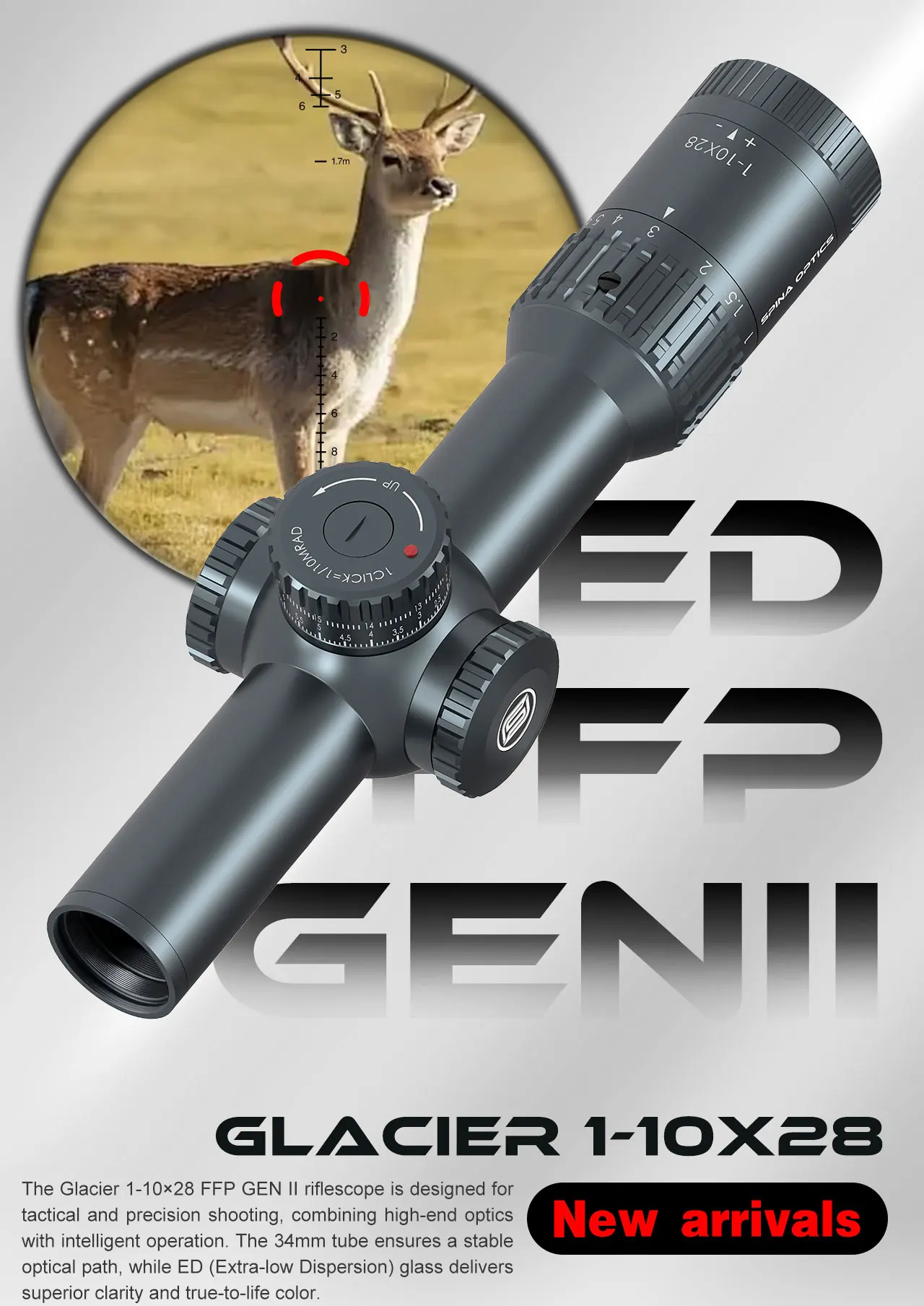 El SPINA ÓPTICA GLACIER ZERO STOP ED 1-10x28 FFP IRredefine el estándar de óptica táctica en compromisos de medio a de corto alcance.Desarrollado para unidades de aplicación del orden de élite, tiradores deportivos ágiles y cazadores que exigen velocidades máximas de respuesta, este óptico variable de baja potencia (LPVO) de la serie GLACIER integra una adquisición de objetivos rápida incomparable, un apuntamiento intuitivo similar a un punto rojo y una durabilidad de grado estratégico., lo que lo convierte en la opción ideal para CQB, competencia multifacética y caza dinámica.