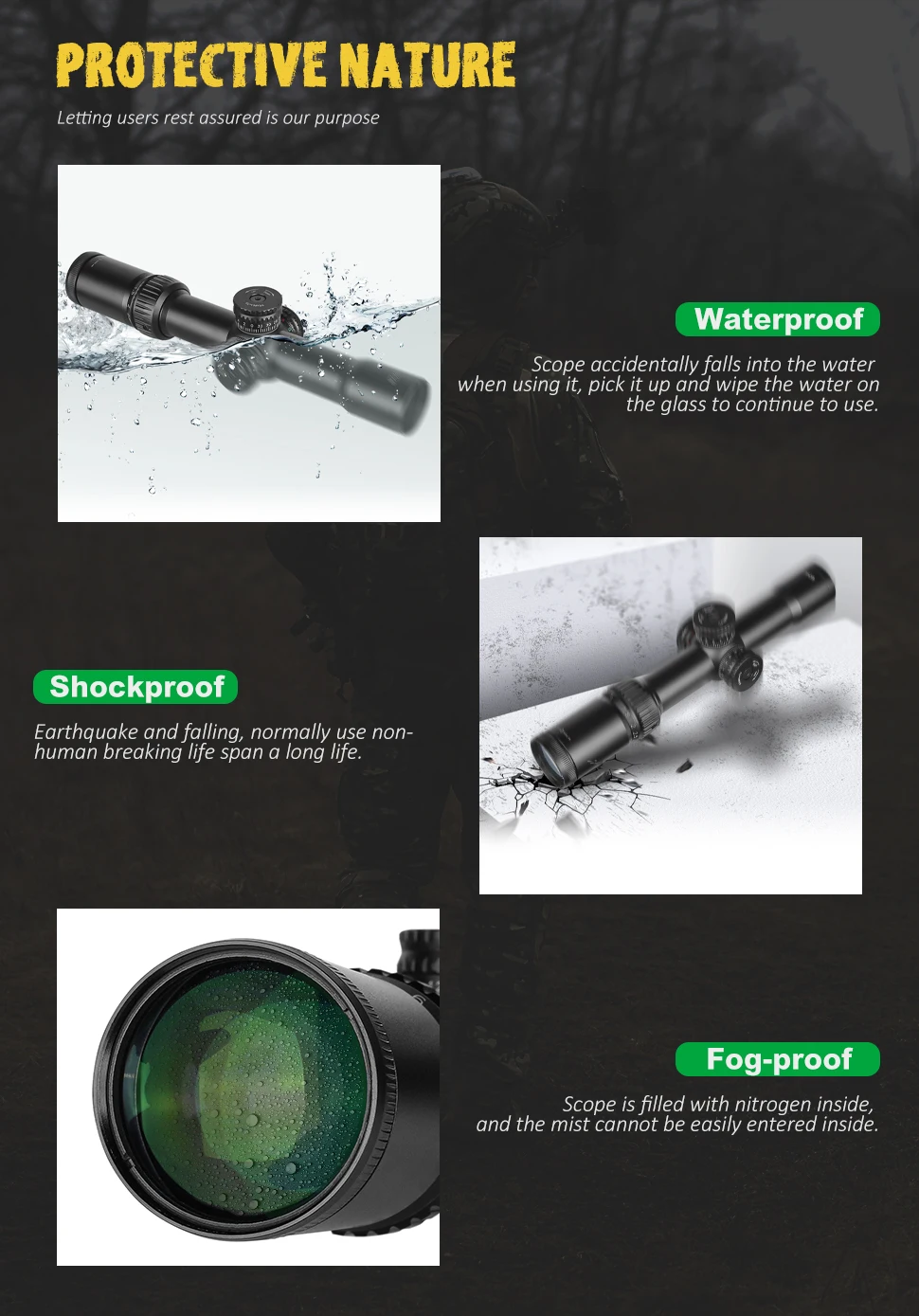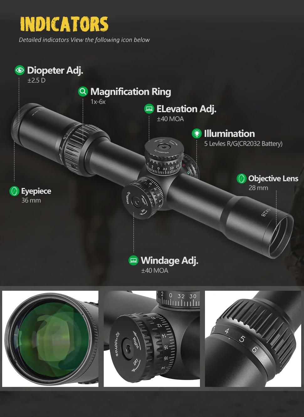 ·Vero LPVO con aumento de 1x-6x.Adecuado para la caza en la jungla para apuntar rápidamente a objetos y disparar.