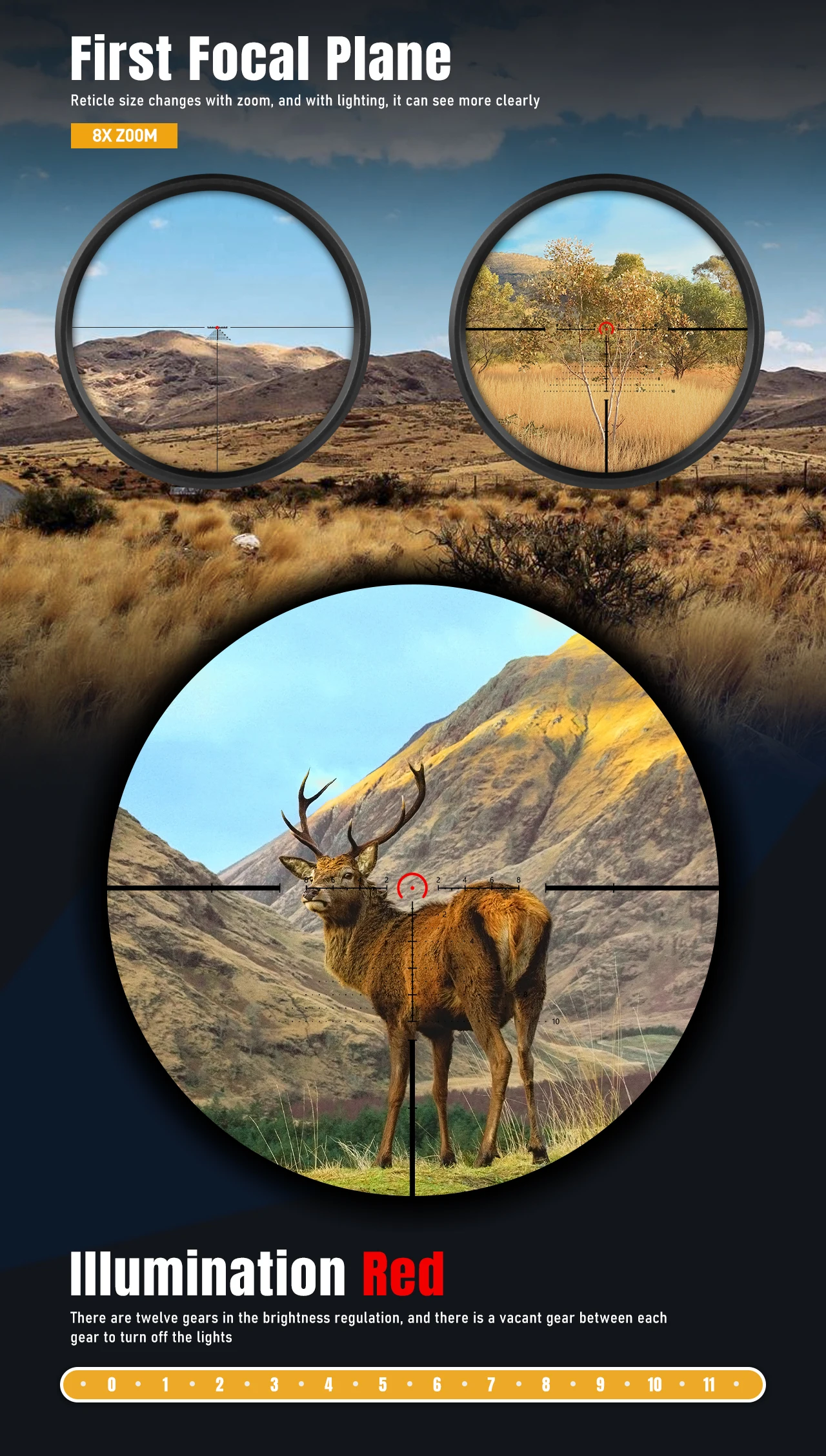Mantiene una subtensión constante en todos los niveles de aumento, lo que garantiza un alcance preciso y correcciones balísticas independientemente del zoom.