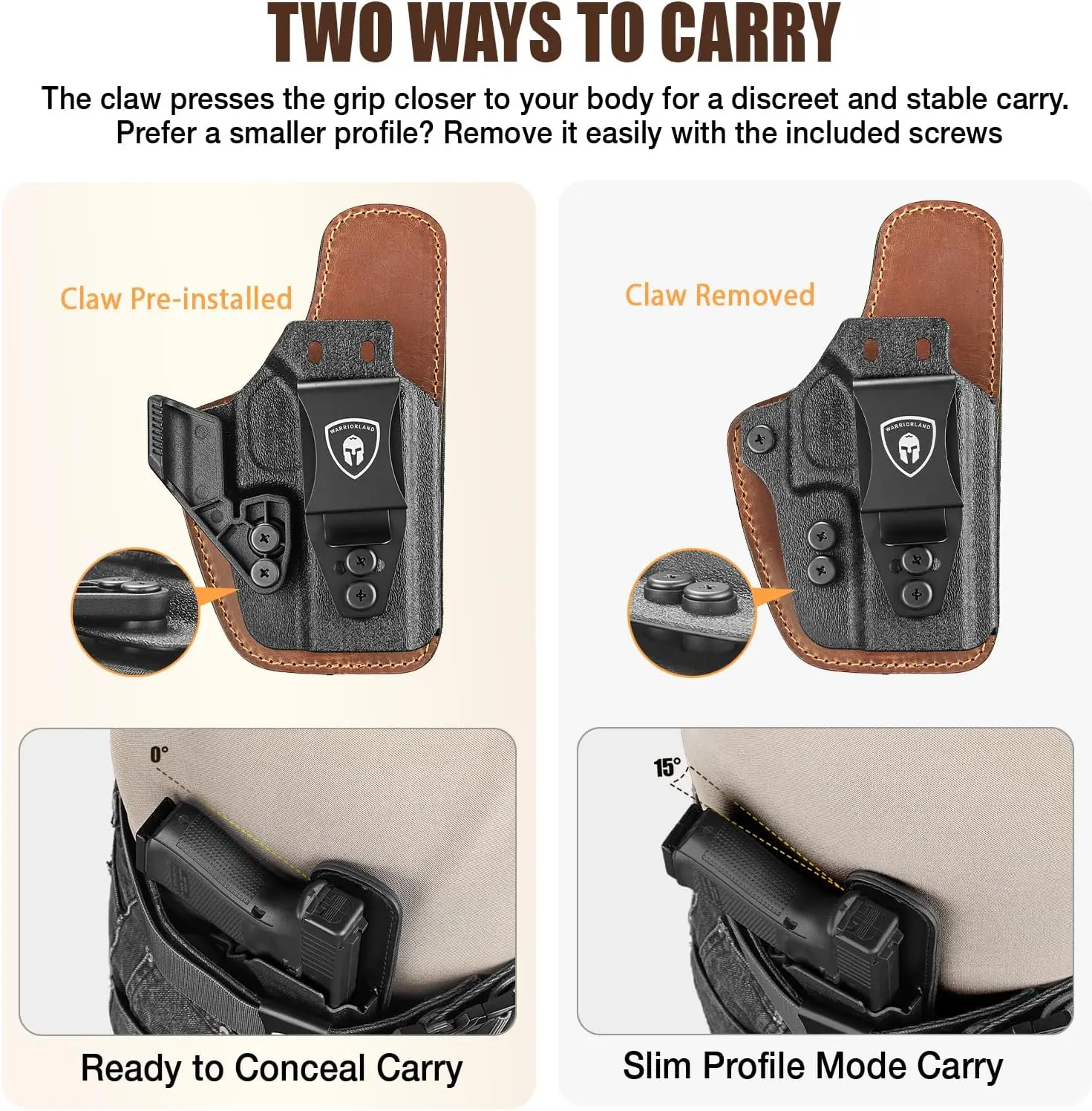 Múltiples formas de transporte para mayor versatilidad: configure su transporte con la garra preinstalada para ocultar, retírela para obtener un perfil delgado o ajuste la altura del clip y use orificios alternativos para diferentes clips (no incluidos)