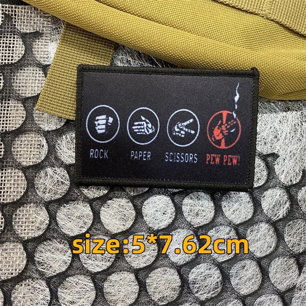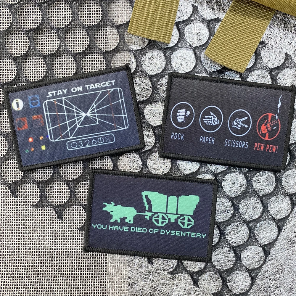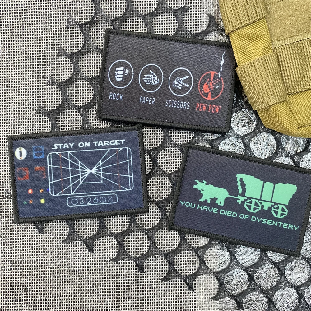 Stay on Target Morale Badge Patch Rock Paper Deadpool Impresión táctica Gancho y bucle Oregon Trail Brazalete Mochila Sombrero Pegatina